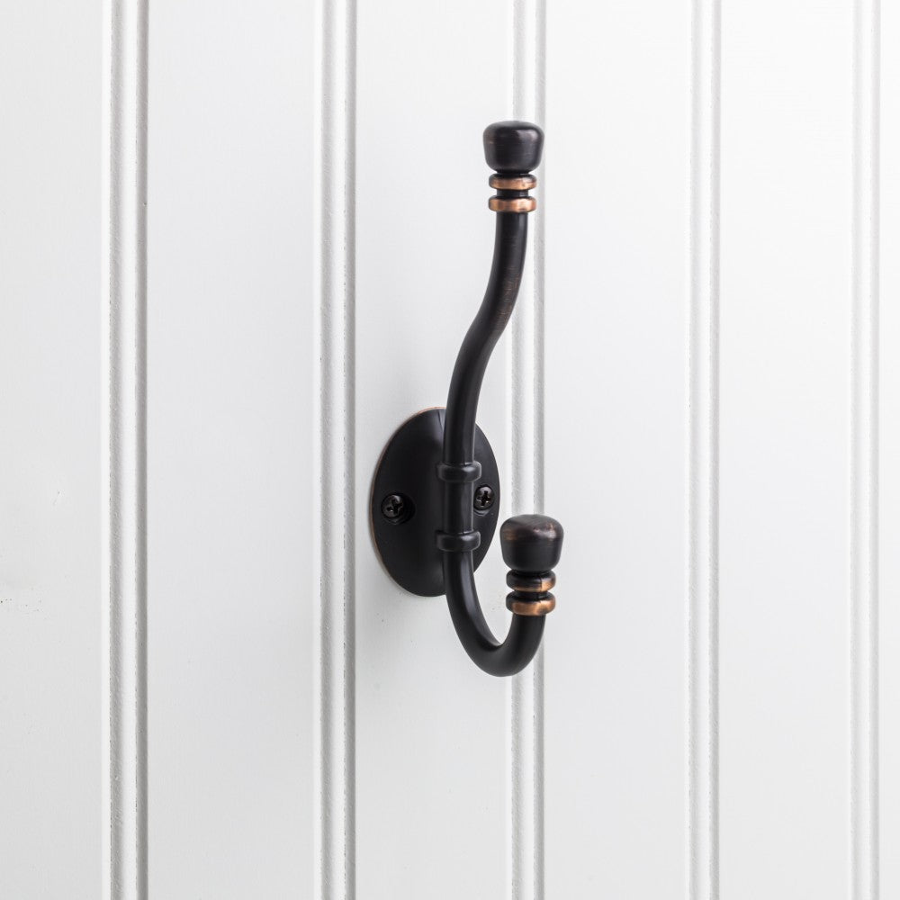 - 5-3/16" Double zinc wall mount decorative coat and hat hook. Includes two 1-1/8" screws. Weight rated up to 35 lbs. Finish: Brushed Oil Rubbed Bronze.