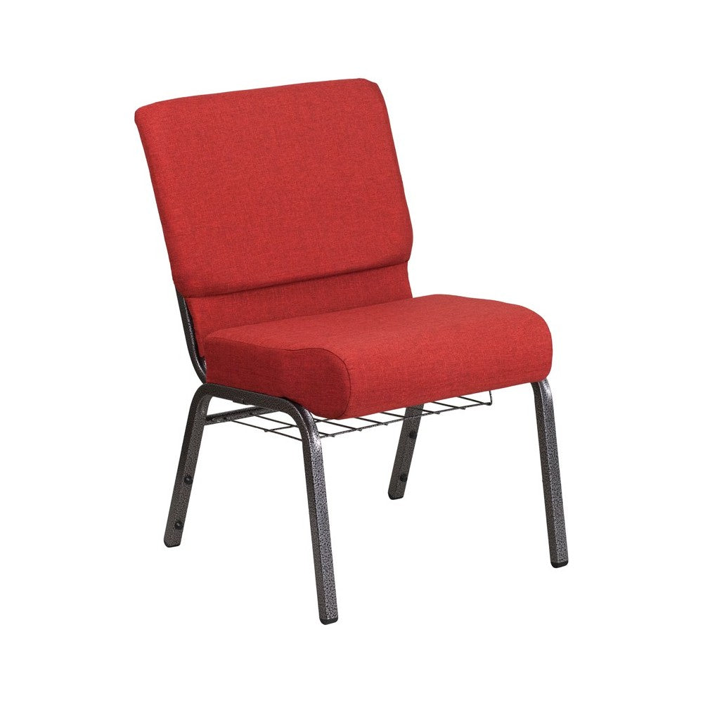 This beautiful, supremely comfortable padded chair will ensure your guests have an enjoyable experience whether you're hosting an all-day seminar, serving a 10 course meal or delivering your most inspirational sermon. Unlike pew seating, these chairs give you the capability to create different seating configurations as often as you wish making them an ideal seating solution for any venue. The auditorium chair with 4" thick seat are generously padded and covered in durable fabric upholstery. The spacious, 21" wide seat has a waterfall edge that provides an extra level of comfort by reducing pressure on your attendees' legs. A convenient book pouch on the back of the chair keeps seminar materials, bibles or hymn books readily available and a book rack under the seat gives everyone a place to store their personal belongings. Its sturdy 16 gauge steel, copper vein frame, with gracefully angled legs, has been tested to hold up to 800 pounds and plastic rocker glides protect your floor by sliding smoothly when you need to move the chair. This commercial side chair is an excellent choice for event venues, hotel lobbies, banquet halls, conference facilities and worship centers. [FD-CH0221-4-SV-RED-BAS-GG]