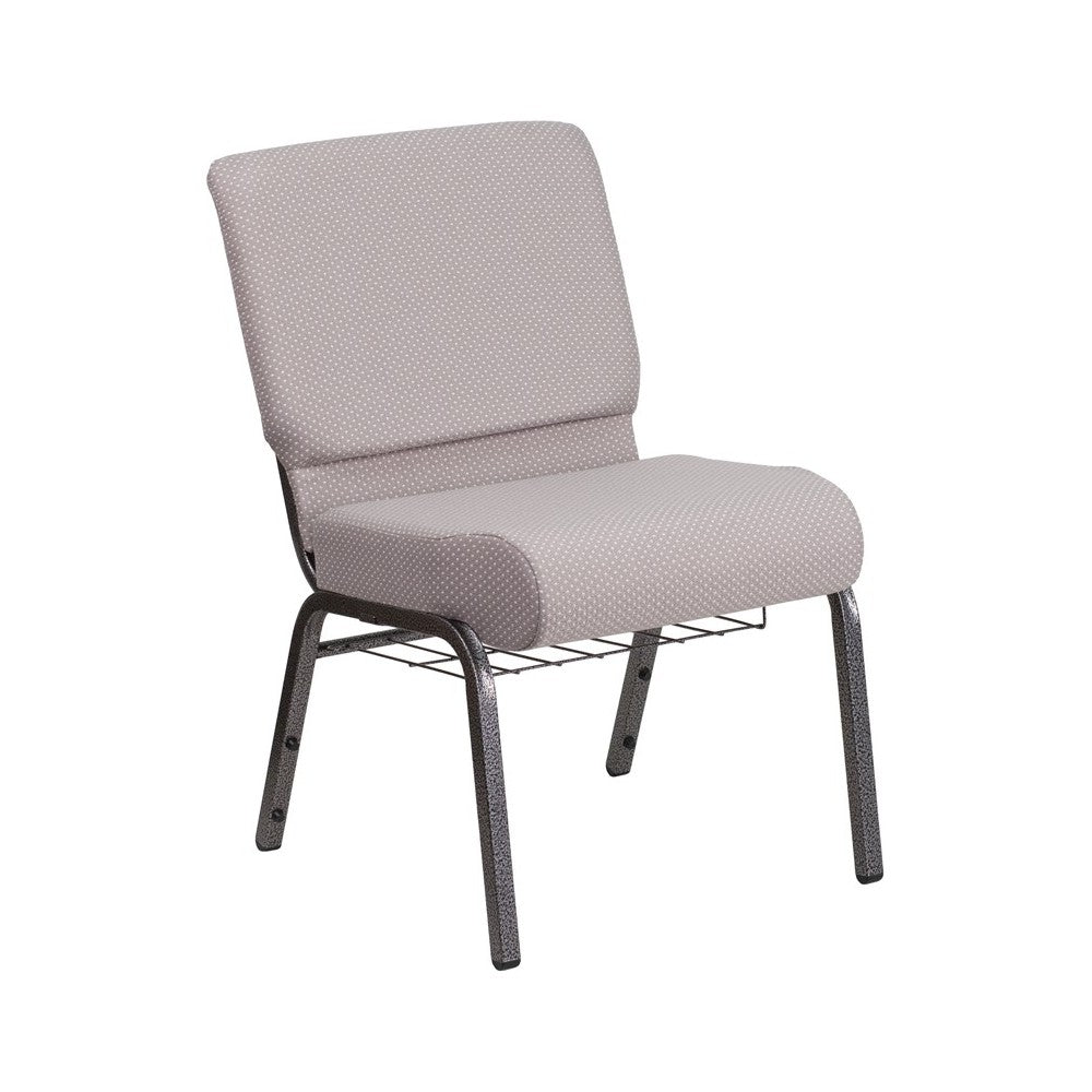 This beautiful, supremely comfortable padded chair will ensure your guests have an enjoyable experience whether you're hosting an all-day seminar, serving a 10 course meal or delivering your most inspirational sermon. Unlike pew seating, these chairs give you the capability to create different seating configurations as often as you wish making them an ideal seating solution for any venue. The auditorium chair with 4" thick seat are generously padded and covered in durable fabric upholstery. The spacious, 21" wide seat has a waterfall edge that provides an extra level of comfort by reducing pressure on your attendees' legs. A convenient book pouch on the back of the chair keeps seminar materials, bibles or hymn books readily available and a book rack under the seat gives everyone a place to store their personal belongings. Its sturdy 16 gauge steel, copper vein frame, with gracefully angled legs, has been tested to hold up to 800 pounds and plastic rocker glides protect your floor by sliding smoothly when you need to move the chair. This commercial side chair is an excellent choice for event venues, hotel lobbies, banquet halls, conference facilities and worship centers. [FD-CH0221-4-SV-GYDOT-BAS-GG]