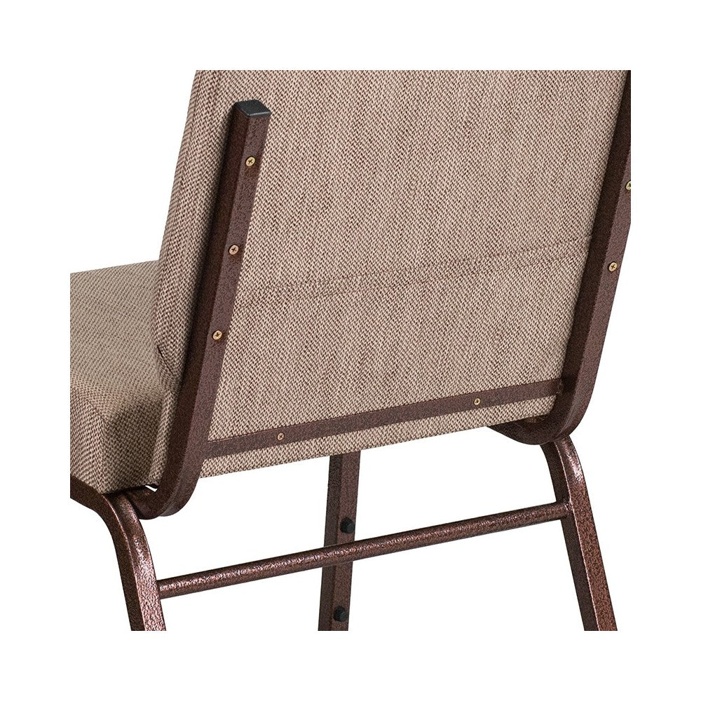 This beautiful, supremely comfortable padded chair will ensure your guests have an enjoyable experience whether you're hosting an all-day seminar, serving a 10 course meal or delivering your most inspirational sermon. Unlike pew seating, these chairs give you the capability to create different seating configurations making them an ideal seating solution for any venue. The upholstered stack chair with 4" thick seat are generously padded and covered in durable fabric upholstery. The spacious, 21" wide seat has a waterfall edge that provides an extra level of comfort by reducing pressure on your attendees' legs. A convenient book pouch on the back of the chair keeps seminar materials, bibles or hymn books readily available. Its sturdy 16 gauge steel, copper vein frame, with gracefully angled legs, has been tested to hold up to 800 pounds and plastic rocker glides protect your floor by sliding smoothly when you need to move the chair. This commercial side chair is stackable for easy storage making it an excellent choice for event venues, hotel lobbies, banquet halls, conference facilities and worship centers. [FD-CH0221-4-CV-BGE1-GG]