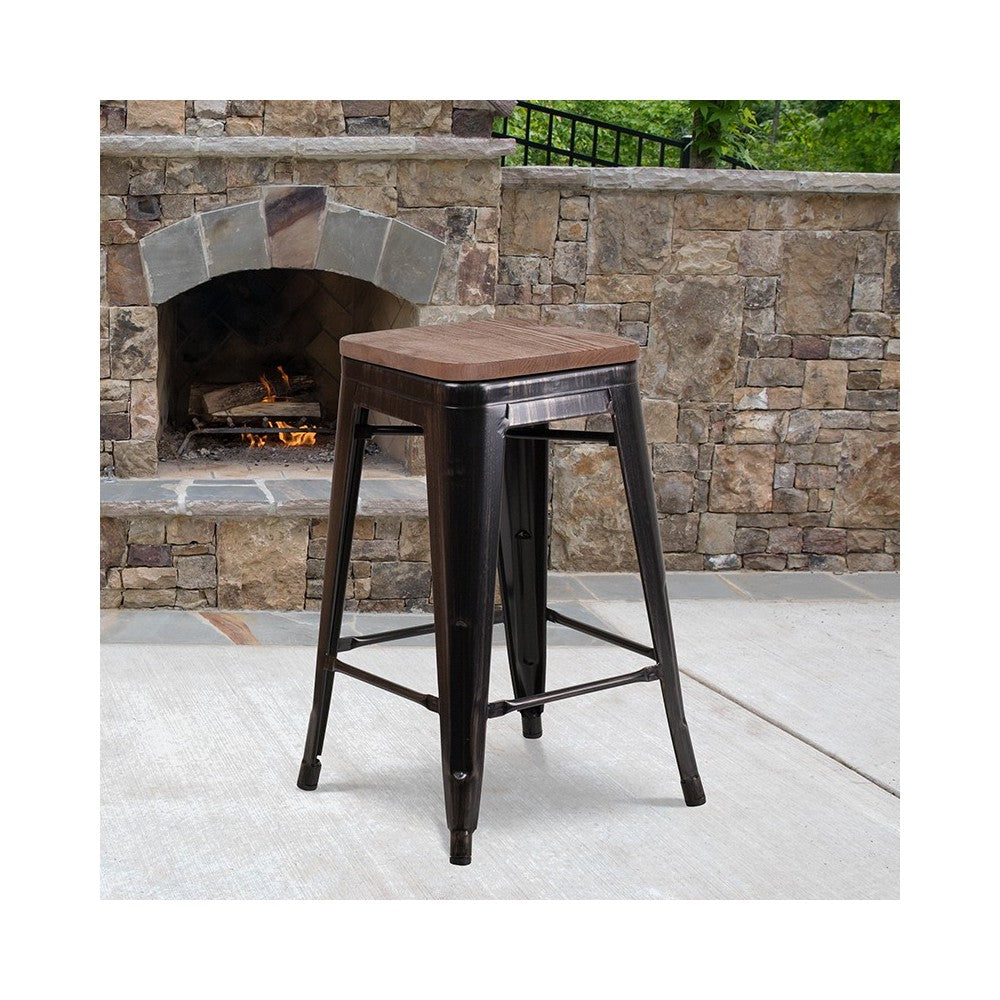 24" High Backless Black-Antique Gold Metal Counter Height Stool with Square Wood Seat