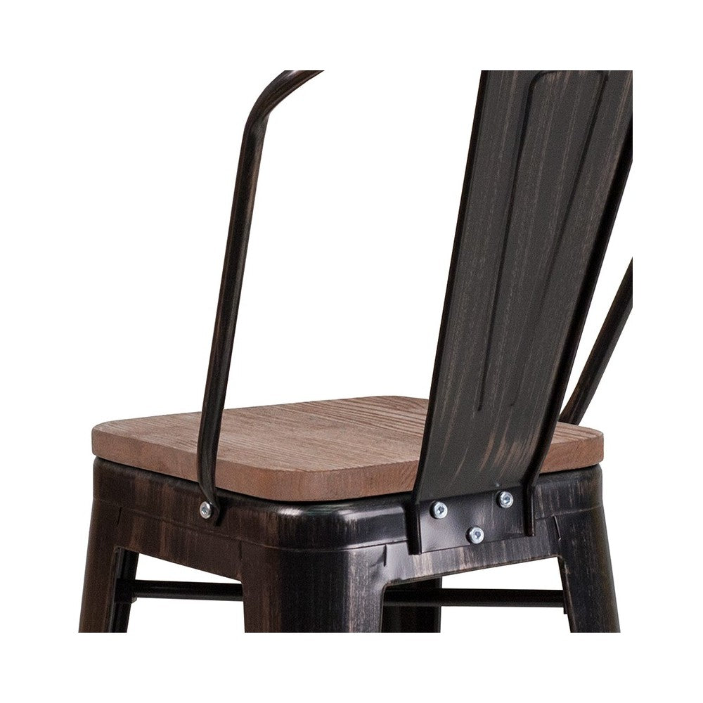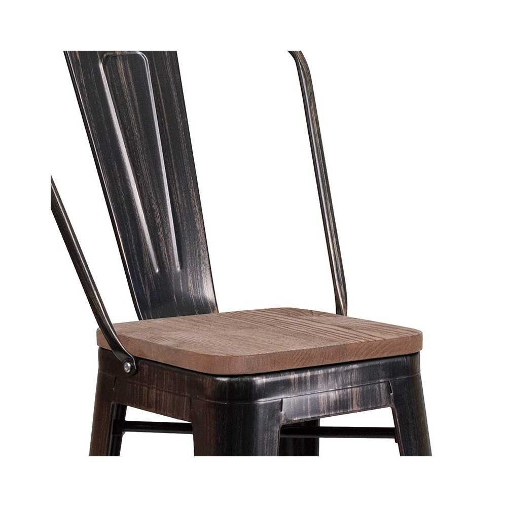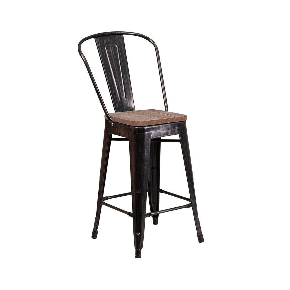 24" High Black-Antique Gold Metal Counter Height Stool with Back and Wood Seat