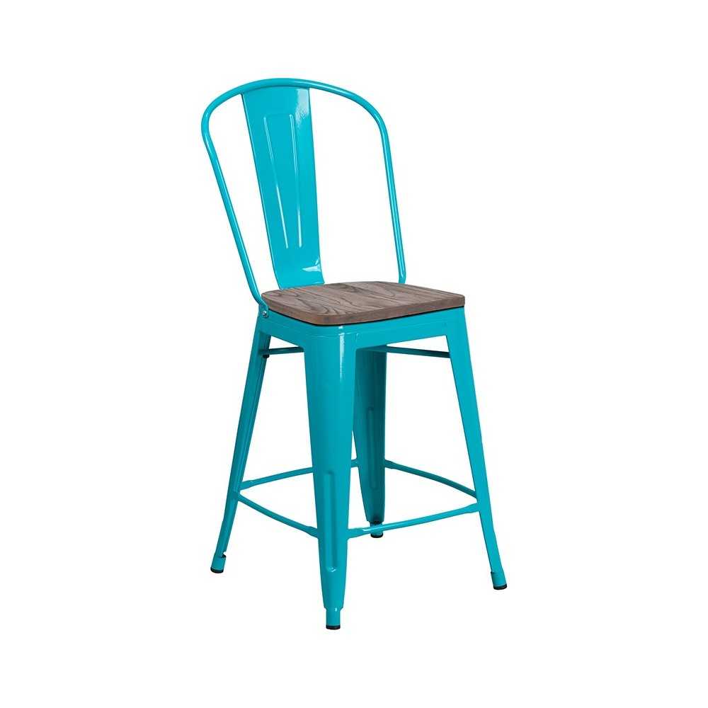 24" High Crystal Teal-Blue Metal Counter Height Stool with Back and Wood Seat