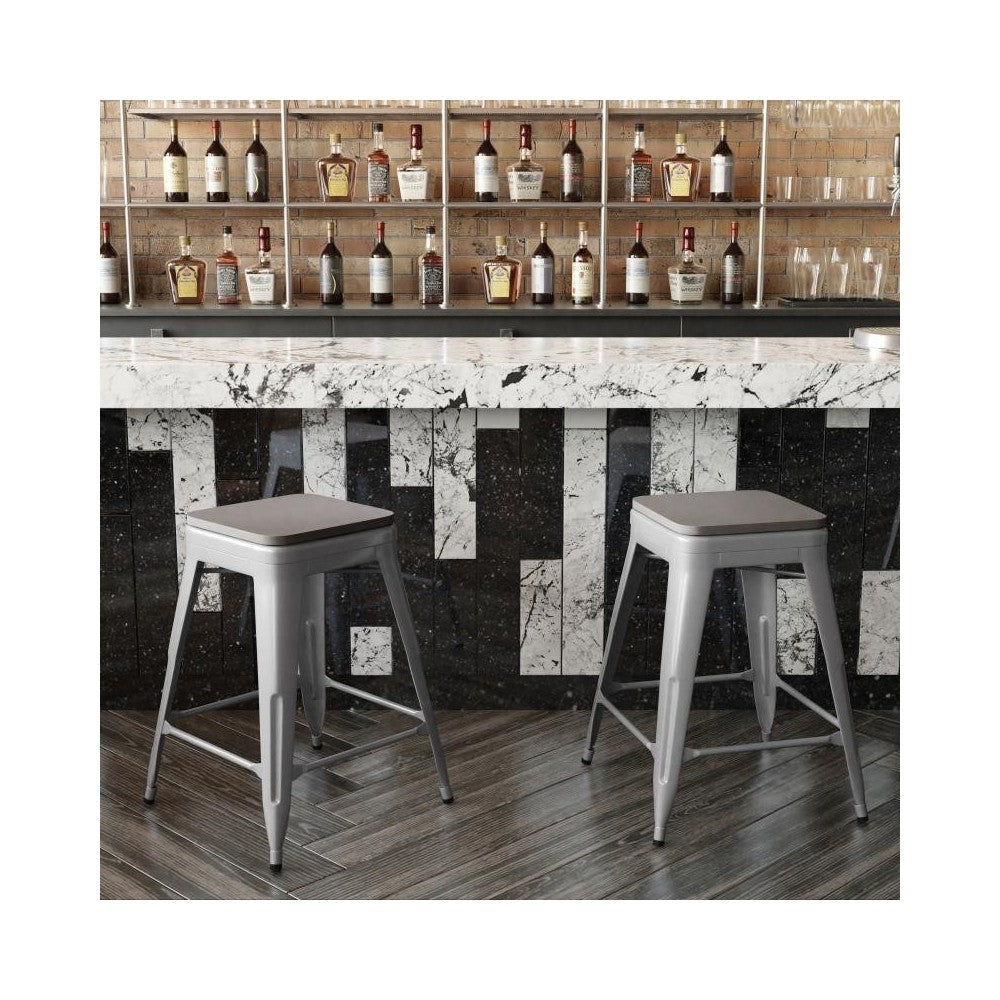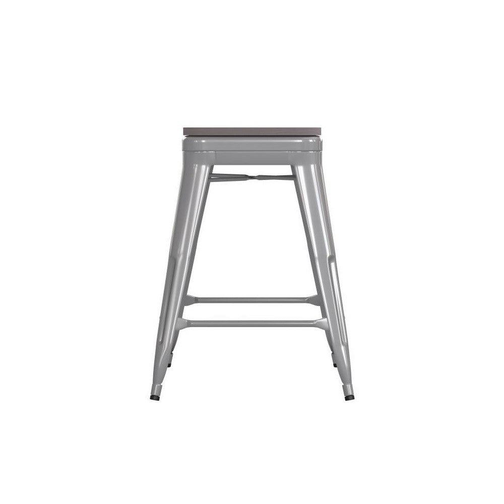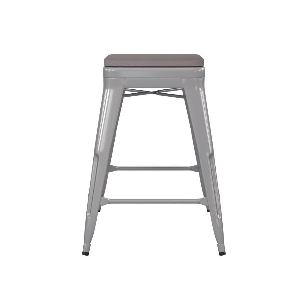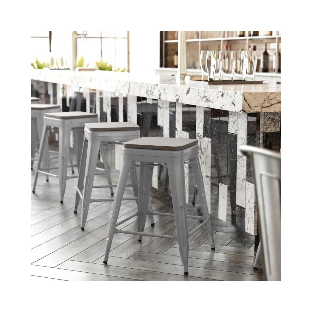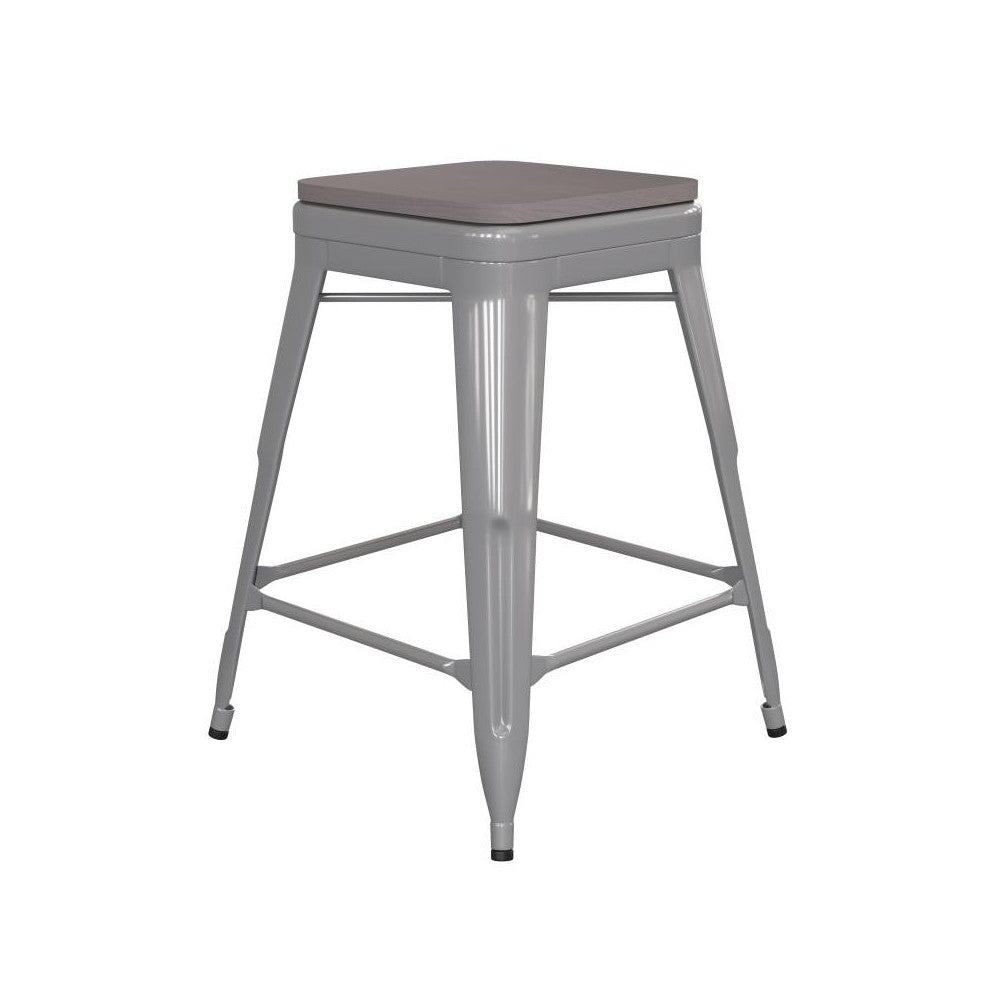 Upgrade the seating in your restaurant, eatery or home with this colorful stackable counter stool boasting an all-weather poly resin seat. This space-saving stool is stackable making it great for storing and features a backless, lightweight design that allows easy movement from inside areas to the patio or sidewalk to enjoy nice weather. A powder coated, galvanized steel frame with cross bracing underneath the seat adds extra stability, holds up to 500 lbs. static weight, and features plastic caps that prevent the finish from scratching when stacked. These dining stools may be stacked from 4-8 chairs high for storage and the legs have protective floor glides that prevent damage to flooring. The polystyrene seats attach quickly to the preassembled chair and cleanup is quick and easy with water and a neutral detergent. [CH-31320-24-SIL-PL2G-GG]