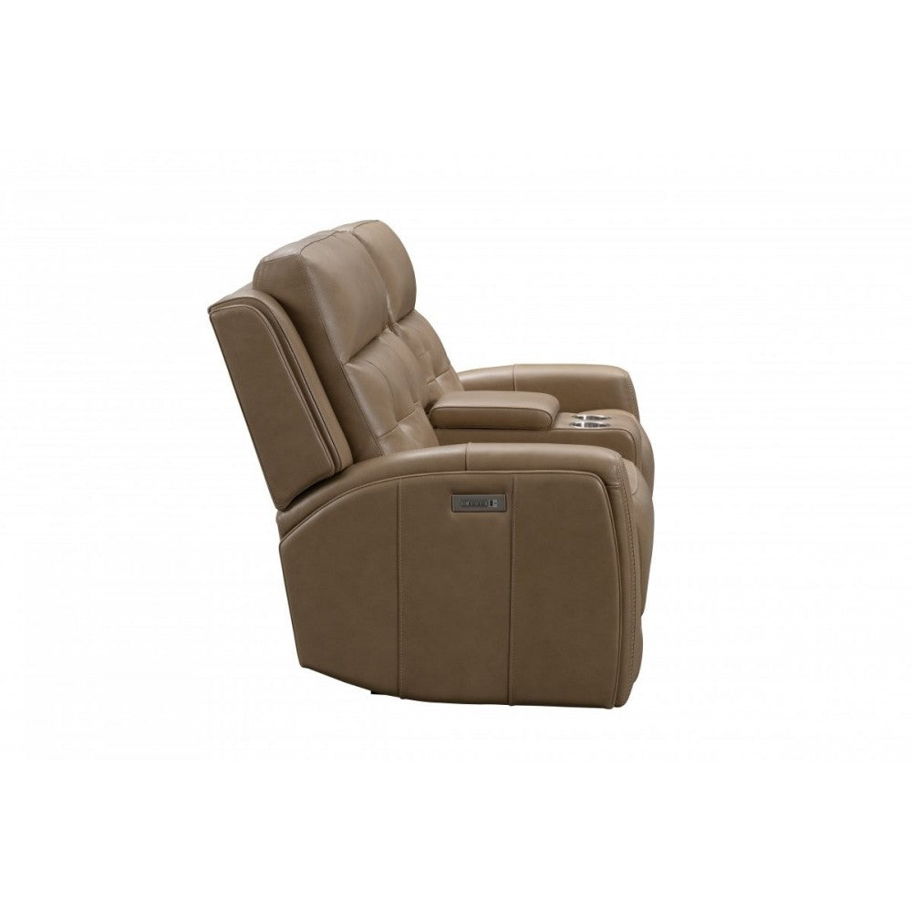 Smaller scale reclining loveseat with power head rest, power lumbar, and power recline. Features include plush winged pub back with buttonless tufts, whip stitching, shaped track arms, pad over chaise bucket seating with pocketed coil springs, and unique arm side panels. Console has hidden storage and 2 cup holders. Outside arm controller with USB ports.