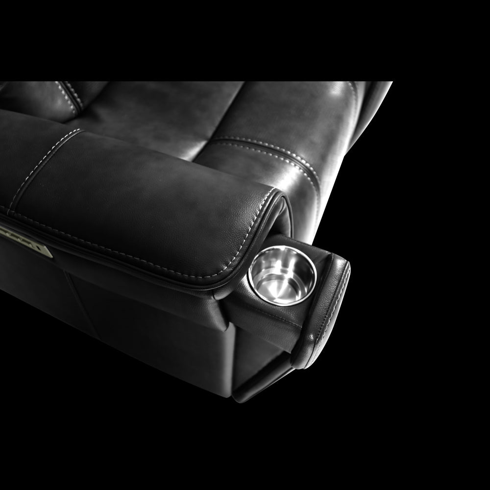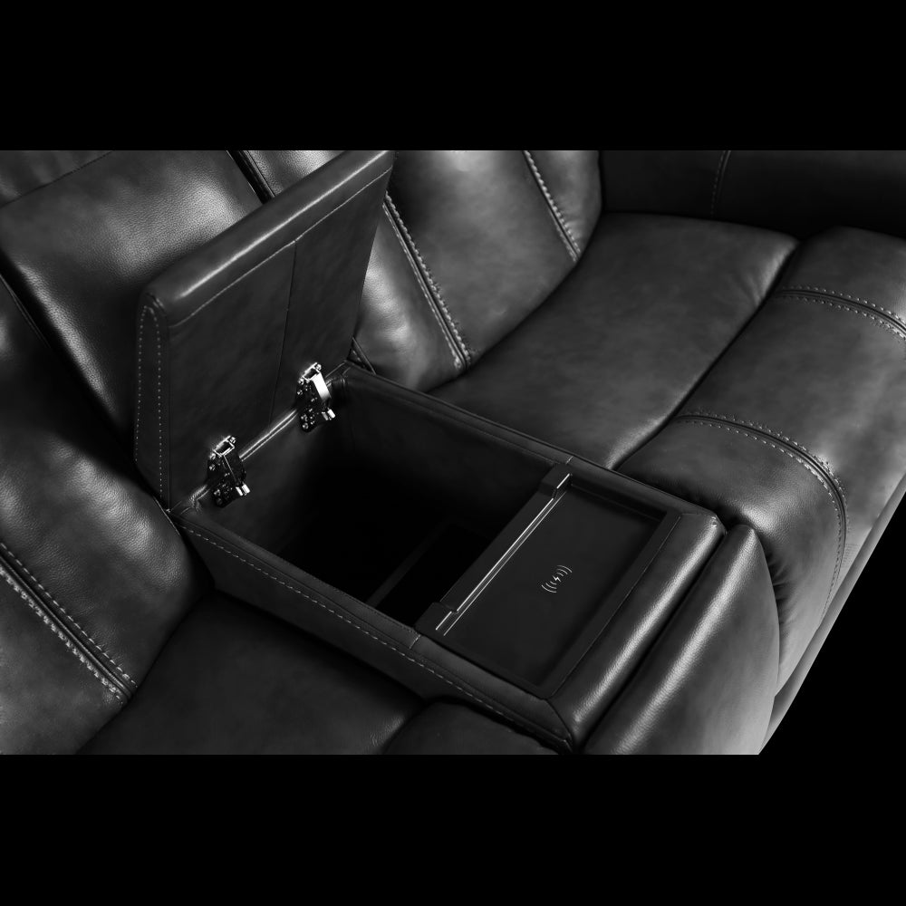 Larger scale Media console loveseat with power head rests, power lumbar, power recline, lay flat mechanisms and 3" footrest extension. Features include 41.7" high horseshoe back, hockey stick shaped plush arms with hidden cupholders, bucket pad over chaise seating with pocketed coil springs, and thick decorative stitching. Storage console with cupholders and wireless charger. Outside arm controllers has all-close button and USB ports