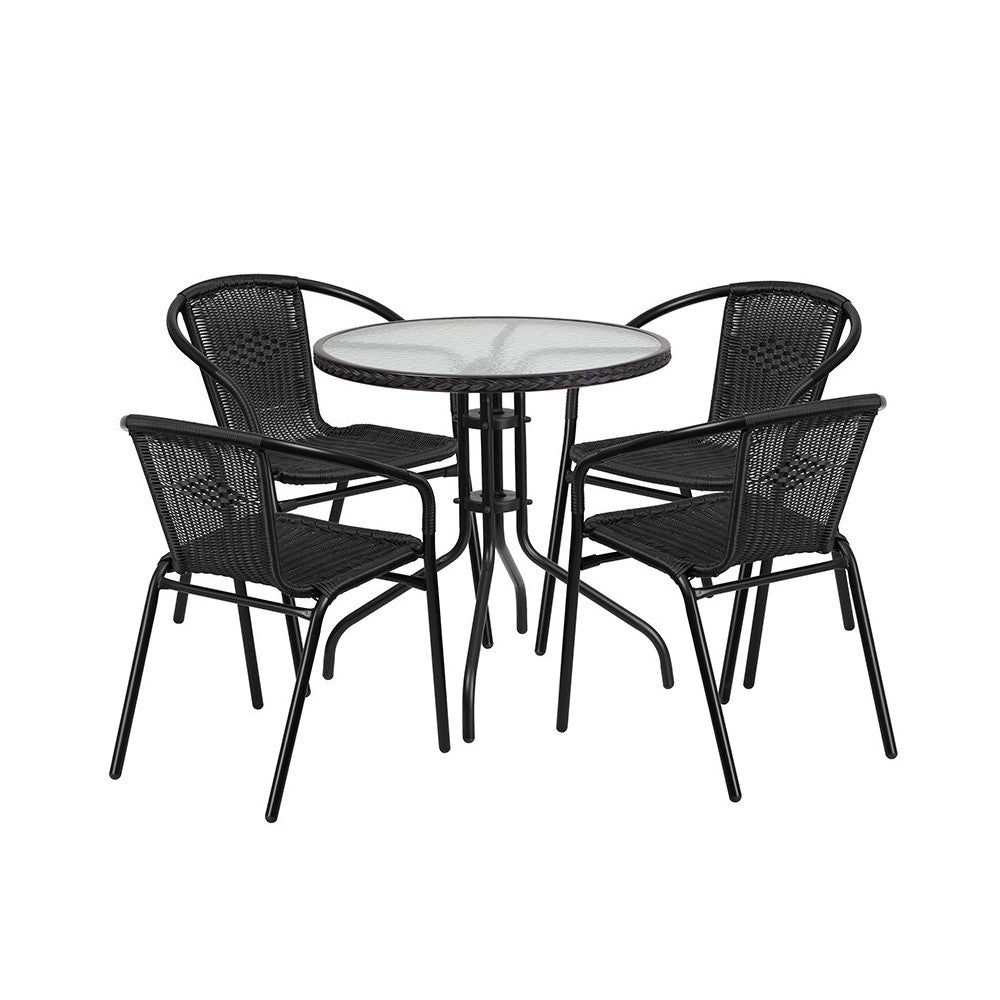 28'' Round Glass Metal Table with Black Rattan Edging and 4 Black Rattan Stack Chairs