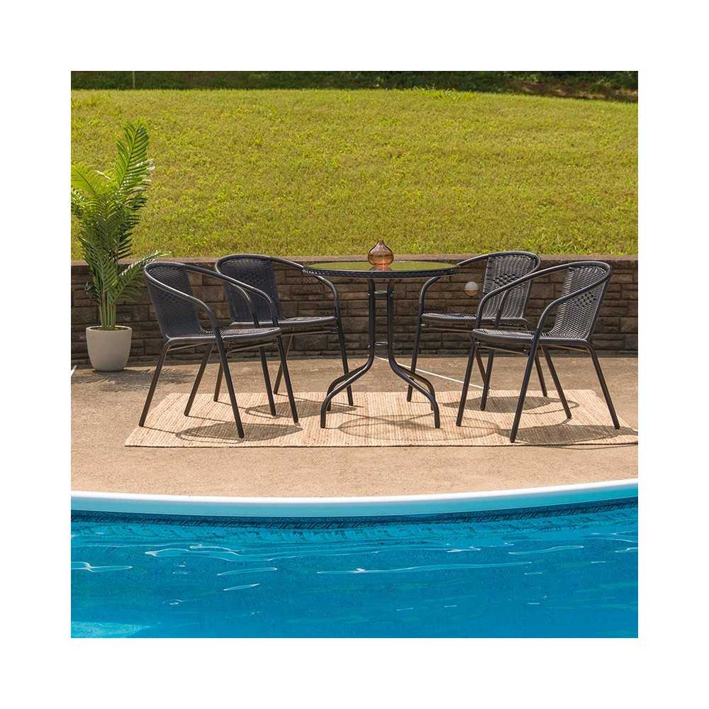If you love hosting family and friends on your deck or need extra seating for the new dining patio of your cafe, this square table and 4 chair set is just what you need. The table's rippled designer glass top has a smooth surface for keeping items level. The rattan edge band complements the chairs and adds just the right touch for a stylish cohesive look. The lightweight chairs feature a curved back, comfortable rattan seat and integrated arms. Cross braces provide extra stability when sitting and these sturdy chairs hold up to 352 lb. weight capacity. For easy storing and cleaning purposes these chairs stack up to 23 high. This set was designed for all-weather use making it a great option for indoor and outdoor settings. For longevity, care should be taken to protect from long periods of wet weather. Whether you are just starting your business, expanding your "al fresco" seating or springing for the outdoor kitchen you've always wanted, this set will give you the perfect look. [TLH-087RD-037BK4-GG]