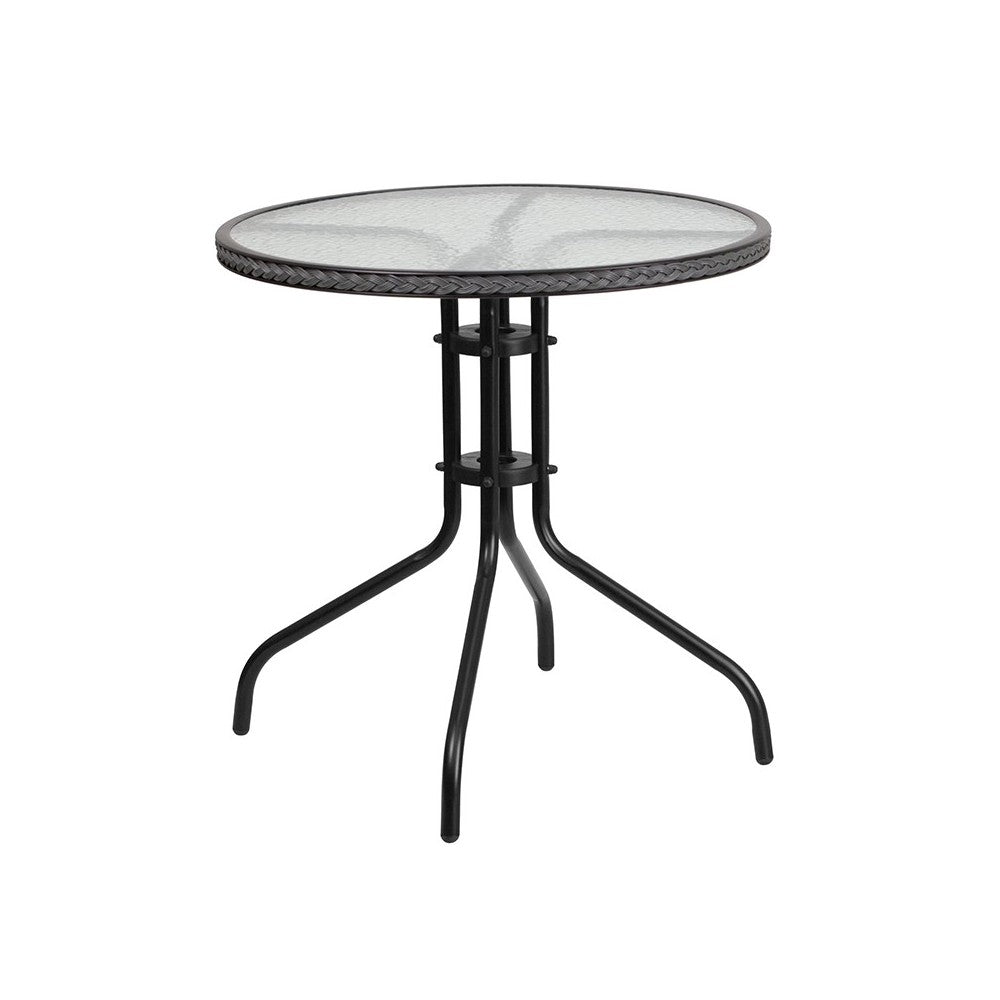 - Round Table: Top Size: 28" Round, 5mm Thick Glass, 1.25" Edge Top, Decorative Black Rattan Edge Band