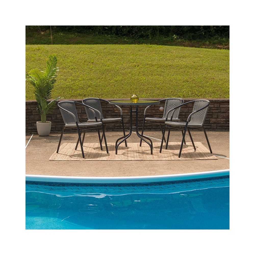 If you love hosting family and friends on your deck or need extra seating for the new dining patio of your cafe, this square table and 4 chair set is just what you need. The table's rippled designer glass top has a smooth surface for keeping items level. The rattan edge band complements the chairs and adds just the right touch for a stylish cohesive look. The lightweight chairs feature a curved back, comfortable rattan seat and integrated arms. Cross braces provide extra stability when sitting and these sturdy chairs hold up to 352 lb. weight capacity. For easy storing and cleaning purposes these chairs stack up to 23 high. This set was designed for all-weather use making it a great option for indoor and outdoor settings. For longevity, care should be taken to protect from long periods of wet weather. Whether you are just starting your business, expanding your "al fresco" seating or springing for the outdoor kitchen you've always wanted, this set will give you the perfect look. [TLH-087RD-037GY4-GG]