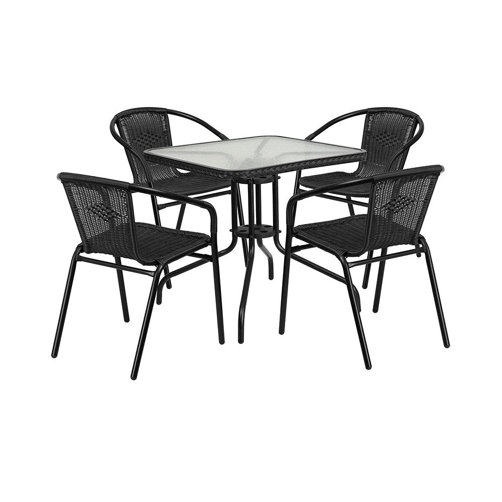 If you love hosting family and friends on your deck or need extra seating for the new dining patio of your cafe, this square table and 4 chair set is just what you need. The table's rippled designer glass top has a smooth surface for keeping items level. The rattan edge band complements the chairs and adds just the right touch for a stylish cohesive look. The lightweight chairs feature a curved back, comfortable rattan seat and integrated arms. Cross braces provide extra stability when sitting and these sturdy chairs hold up to 352 lb. weight capacity. For easy storing and cleaning purposes these chairs stack up to 23 high. This set was designed for all-weather use making it a great option for indoor and outdoor settings. For longevity, care should be taken to protect from long periods of wet weather. Whether you are just starting your business, expanding your "al fresco" seating or springing for the outdoor kitchen you've always wanted, this set will give you the perfect look. [TLH-073SQ-037BK4-GG]