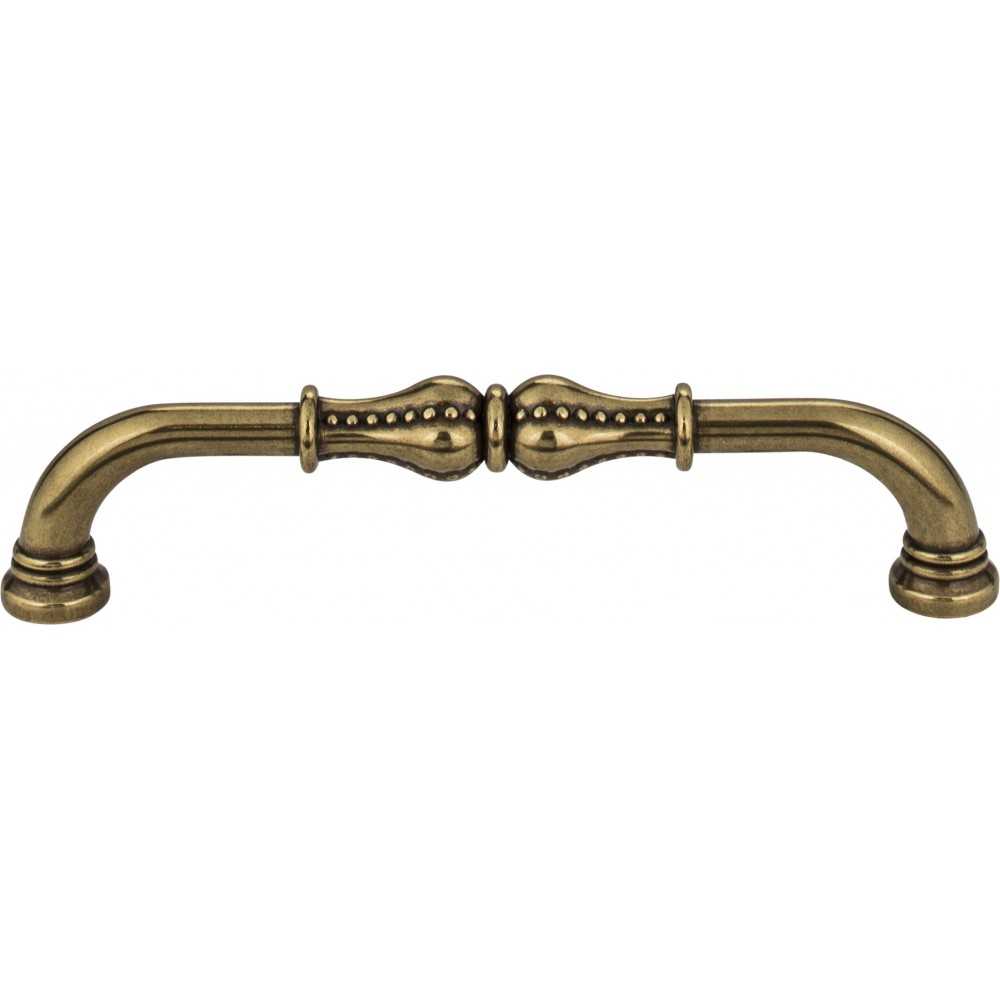- 5-11/16" Overall Length Beaded Cabinet Pull. Holes are 128 mm center-to-center. Packaged with two 8-32 x 1" screws. Finish: Distressed Antique Brass