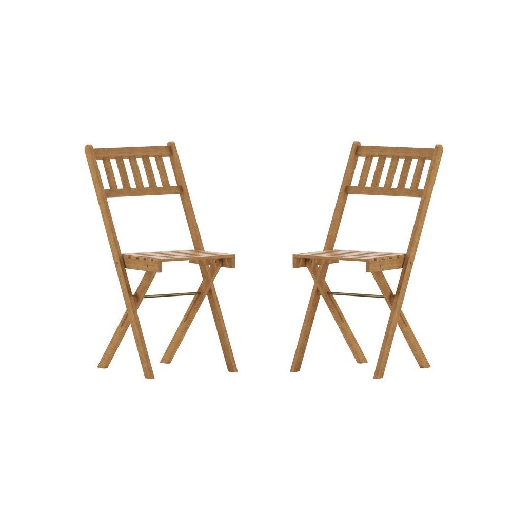 Relaxing with friends, visiting your favorite campsite, or gathering around the firepit just got much more comfortable and stylish with this set of 2 solid acacia wood folding bistro chairs. Made from naturally weather-resistant acacia wood, supported by a strong, but lightweight, X-shaped frame, and given a slatted design that assists with air flow and drying, these patio chairs will give you long-lasting seating indoors or out. Lightweight but strong, this set of 2 chairs holds up to 300 lbs. static weight. Clean this set with a damp cloth and teak oil may be purchased to recoat the wood as needed to preserve the finish. [THB-C1244-NAT-GG]