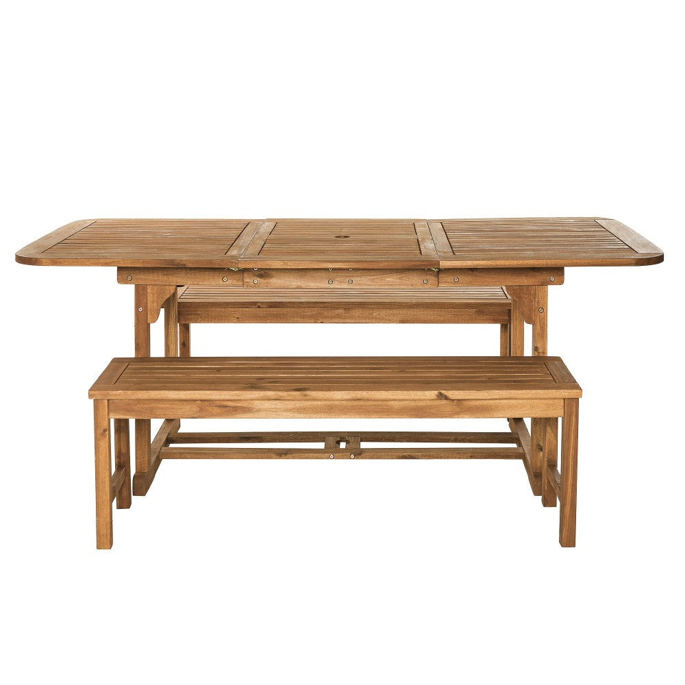 Create an additional dining space on any deck or patio with this charming patio 3-piece dining set. Constructed from solid acacia hardwood, this set is naturally sturdy yet stylish. Entertain additional guests with the hide-away butterfly leaf and three-seater benches. Relax and enjoy the outdoors with this exceptional dining set which includes two benches and table.