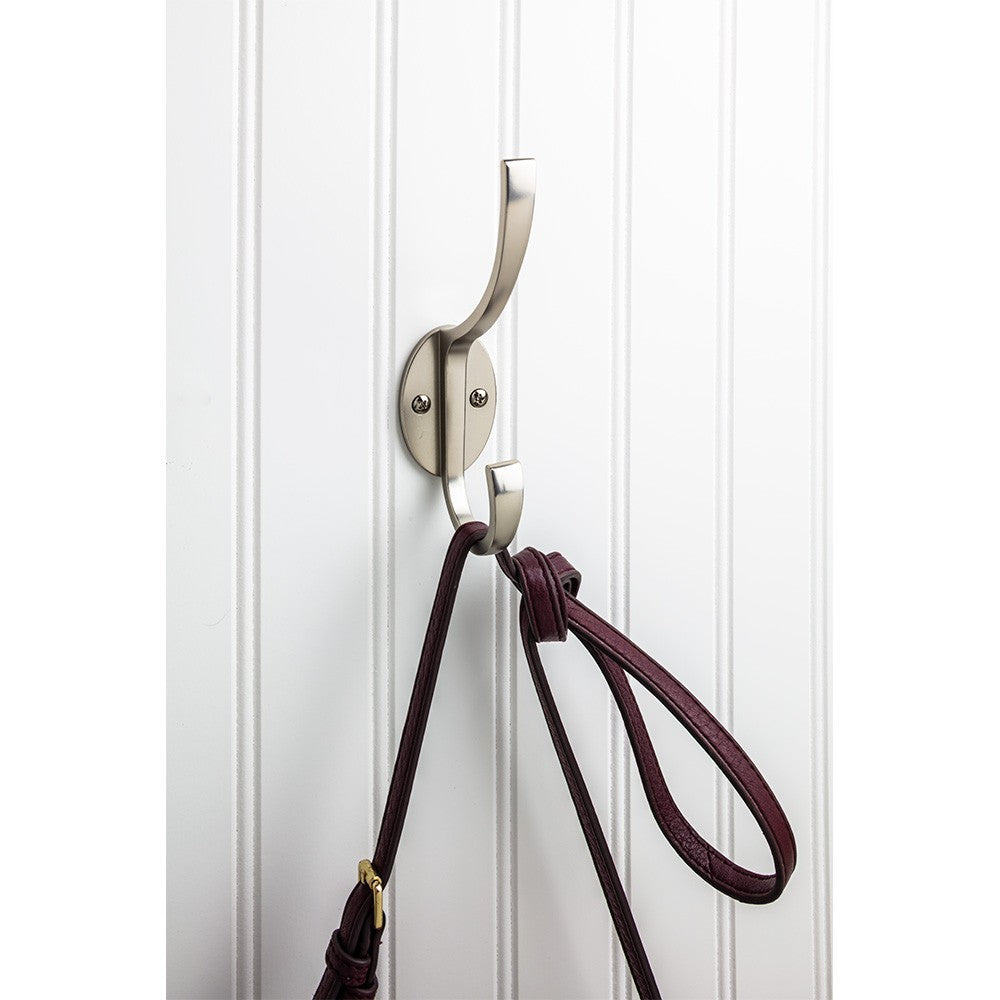 - 5-7/8" Double zinc wall mount decorative coat and hat hook. Includes two 1-1/8" screws. Weight rated up to 35 lbs. Finish: Satin Nickel.