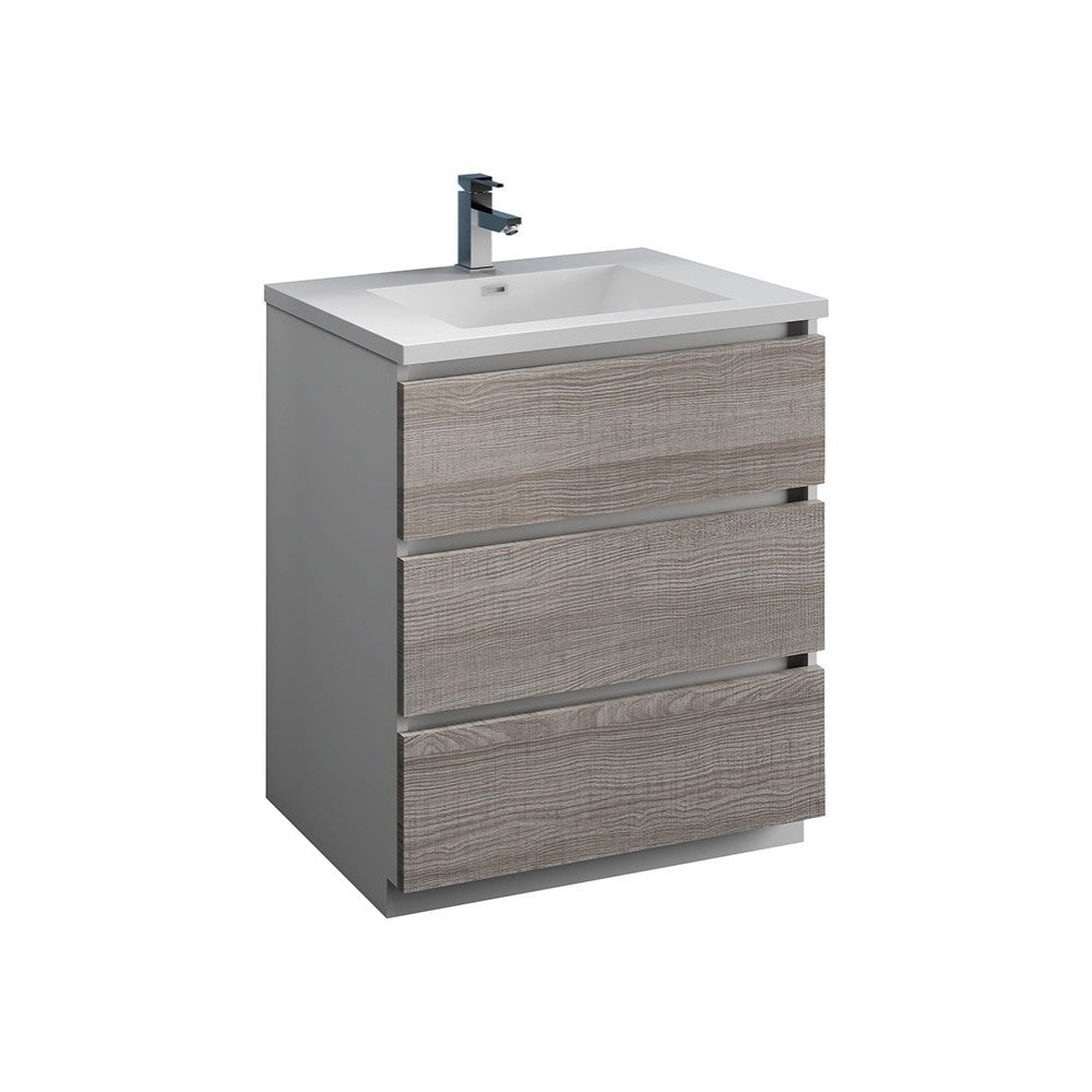 With its chic Ash Gray finish, the Fresca Lazzaro Freestanding Modern Bathroom Cabinet with Integrated Sink is the ideal combination of style and function. The cabinet offers great storage with soft-closing drawers, just perfect for organizing all of your daily essentials. The drawers feature push-release hardware, offering a streamlined front that beautifully complements the minimalist design. Gracing the top of the cabinet is an eye-catching white acrylic-resin countertop/sink with smooth edges and integrated overflow. The sink has been pre-drilled to accommodate a single hole faucet (sold separately). This modern cabinet with integrated sink will enhance any decor and is available in multiple sizes and finishes. It includes installation hardware