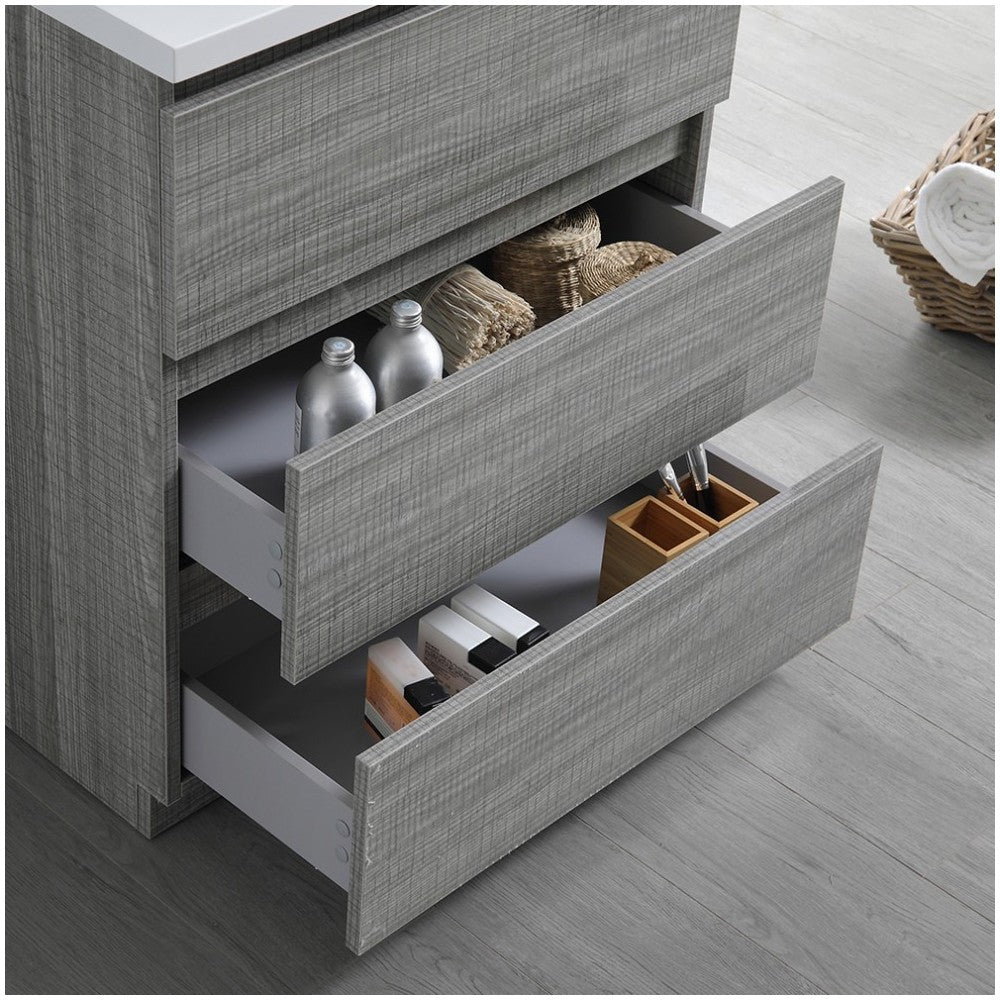 With its chic Ash Gray finish, the Fresca Lazzaro Freestanding Modern Bathroom Vanity is the ideal combination of style and function. The cabinet offers great storage with soft-closing drawers, just perfect for organizing all of your daily essentials. The drawers feature push-release hardware, offering a streamlined front that beautifully complements the minimalist design. To make installation a breeze, the cabinet comes fully assembled and includes installation hardware. Gracing the top of the cabinet is an eye-catching white acrylic-resin countertop/sink with smooth edges and integrated overflow. The sink is designed for durability and style and has been pre-drilled to accommodate a single hole faucet (included). This vanity also comes with a fully mirrored medicine cabinet with two adjustable glass shelves, to complete the look. This modern vanity is available in multiple colors and makes a stylish statement in any home