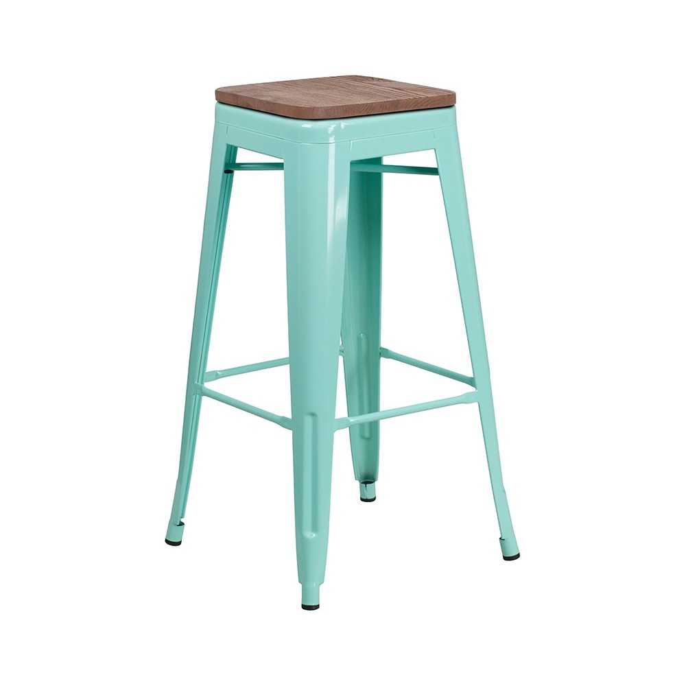Save on space with this Backless Metal Bar Stool with wood seat. The clean lines and simple design of this square, industrial style stool will look great in your kitchen or inside your bar/restaurant. Designed to stack, this stool is an ideal choice in the restaurant industry. A cross brace underneath the seat adds extra stability and features plastic caps that prevent the finish from scratching when stacked. The lower support brace doubles as a footrest, and floor glides protect your floor by sliding smoothly when moving it. Designed for both commercial and residential use, this bar height stool will provide refreshing rustic feel with its metal and wood features. [ET-BT3503-30-MINT-WD-GG]