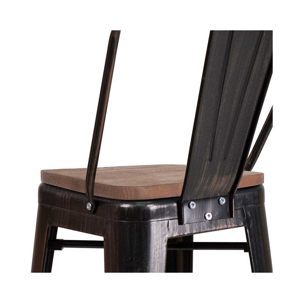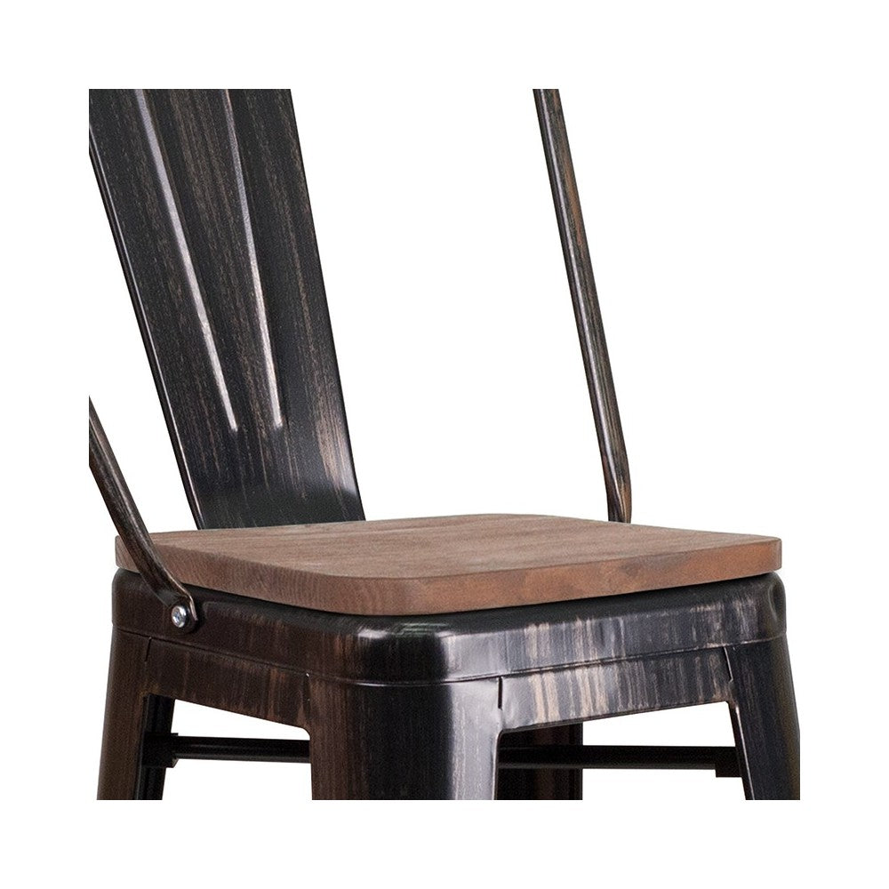 30" High Black-Antique Gold Metal Barstool with Back and Wood Seat
