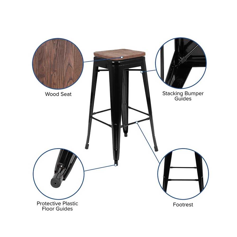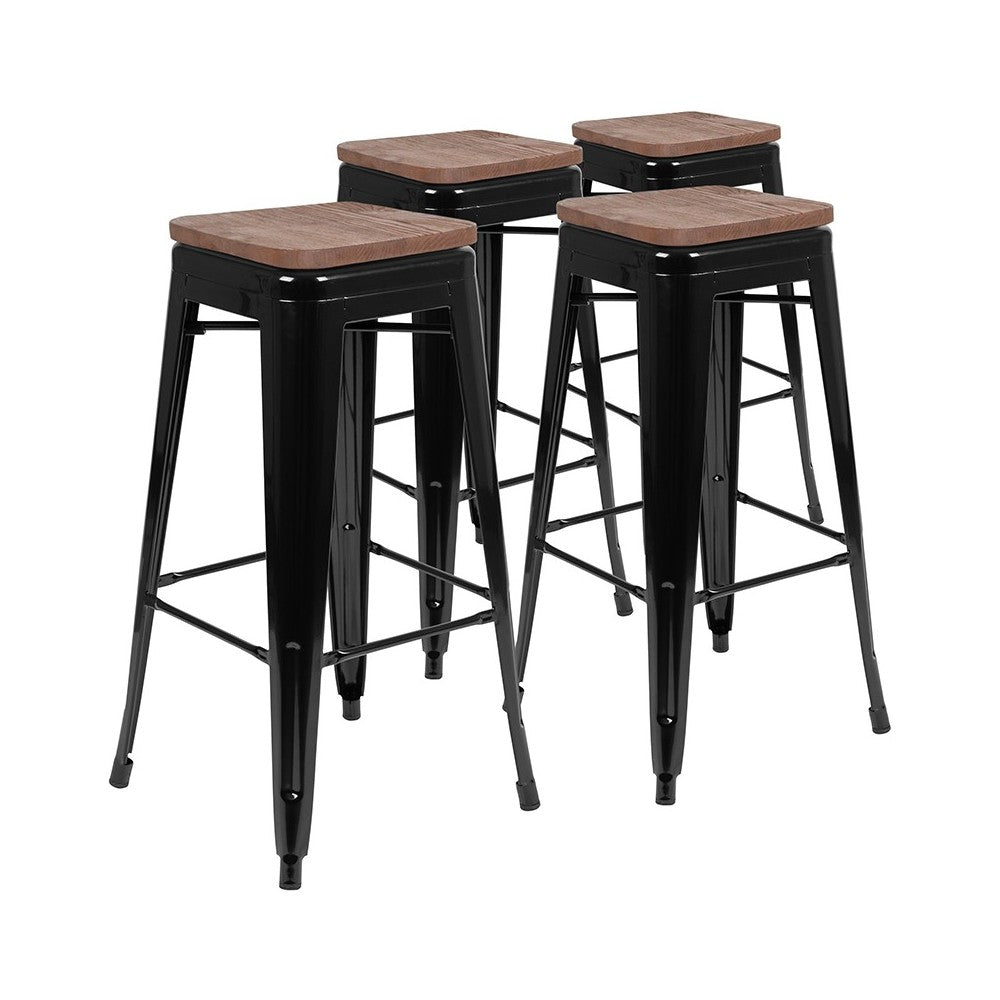 30" High Metal Indoor Bar Stool with Wood Seat in Black - Stackable Set of 4