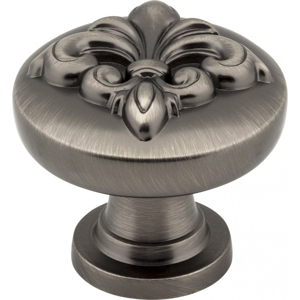 - 1-3/8" Overall Length Raised Fleur-de-lis Cabinet Knob. Packaged with one 8-32 x 1" and 1-3/4" Break-away screw. Finish: Brushed Pewter