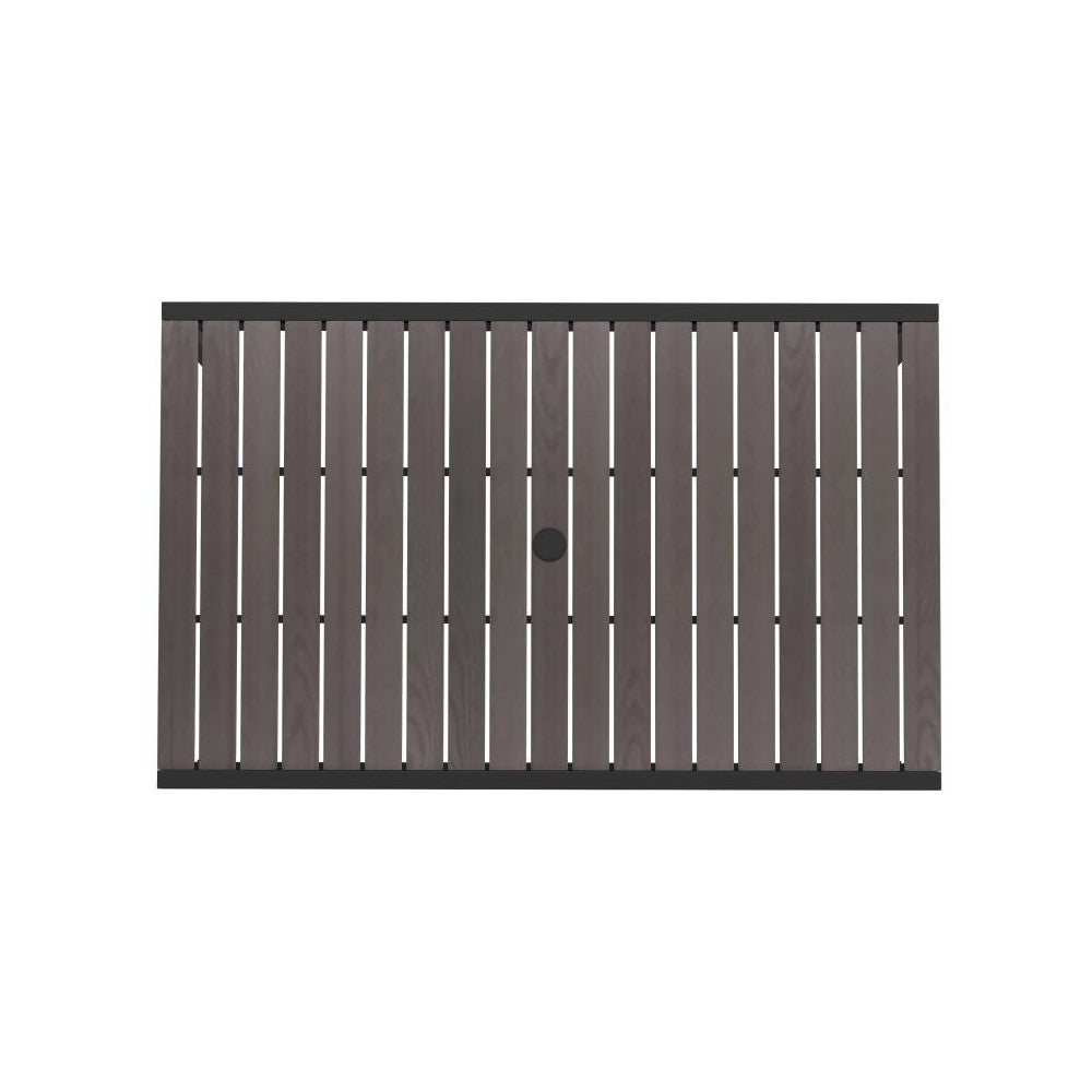 Upgrade the look of your indoor or outdoor space with this rectangular steel framed dining table with faux teak poly slats. Patrons love to dine al fresco, and this all-weather dining table comfortably seats up to 4 adults. Trending natural colored synthetic faux teak slats contrast beautifully with the black metal frame and blend seamlessly in almost any decor. Pick the umbrella that suits your personal taste and insert it into the umbrella holder hole to remain cool while outside. Entertain guests at home or your neighborhood restaurant with this no-stress table. The 18 gauge steel frame features metal screw construction that holds up to 300 Lbs. static weight capacity to effortlessly hold your favorite dishes. Powder coating helps resist nicks and scratches and is weather-resistant for year-round use though care should be taken to protect from prolonged periods of wet weather. The faux teak poly slatted top won't peel, chip, or rot making this dining table very low maintenance. Whether your furnishing your residential or commercial space, quick setup is essential. This outdoor dining table assembles in 30 minutes or less for quick use. Clean your new table with a damp cloth to maintain great looks. Fixed glides will maintain the health of your hard flooring surfaces when being used indoors. Purchase several of these outdoor dining tables and pair them with our faux teak side table for the complete setup. [XU-DG-UH3048-GY-GG]