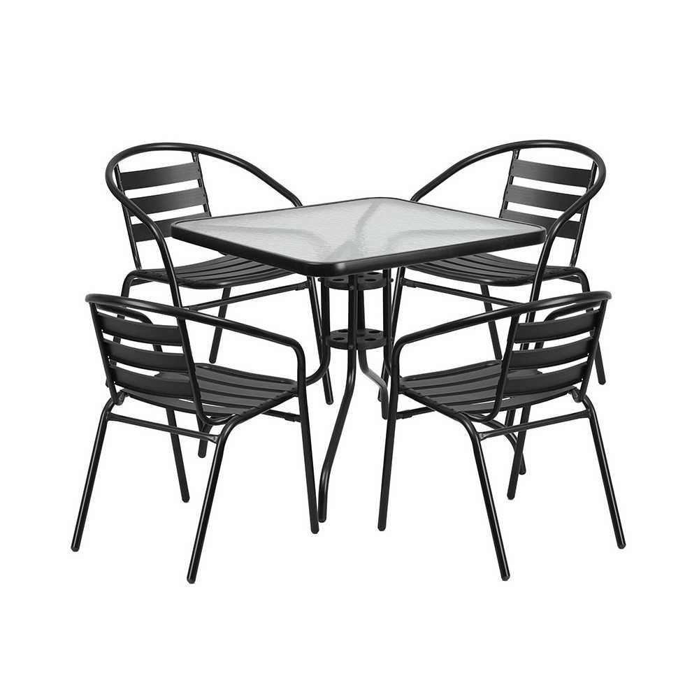 If you love hosting family and friends on your deck or need extra seating for the new dining patio of your cafe, this square table and 4 chair set is just what you need. The table's rippled designer glass top has a smooth surface for keeping items level. The lightweight chairs feature a curved aluminum triple slat back, textured seat and integrated arms. Cross braces provide extra stability when sitting and these sturdy chairs hold up to 352 lb. weight capacity. For easy storing and cleaning purposes these chairs stack up to 4 high. This set was designed for all-weather use making it a great option for indoor and outdoor settings. For longevity, care should be taken to protect from long periods of wet weather. Whether you are just starting your business, expanding your "al fresco" seating or springing for the outdoor kitchen you've always wanted, this set will give you the perfect look. [TLH-0732SQ-017CBK4-GG]