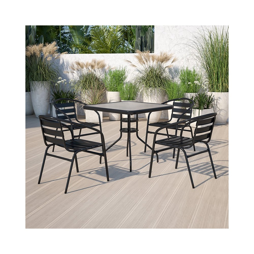 31.5'' Square Glass Metal Table with 4 Black Metal Aluminum Slat Stack Chairs