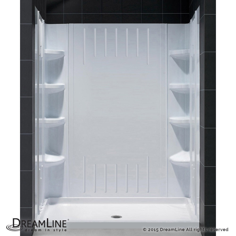 - Kit Includes: QWall-3 Backwalls and Single Threshold SlimLine Base; Drain Location: Center; Color: White