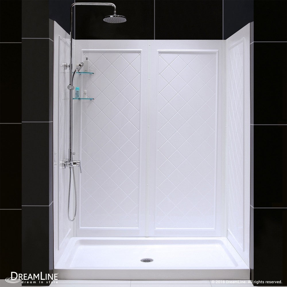- Kit Includes: QWall-5 Backwalls and Single Threshold SlimLine Base; Drain Location: Center; Color: White