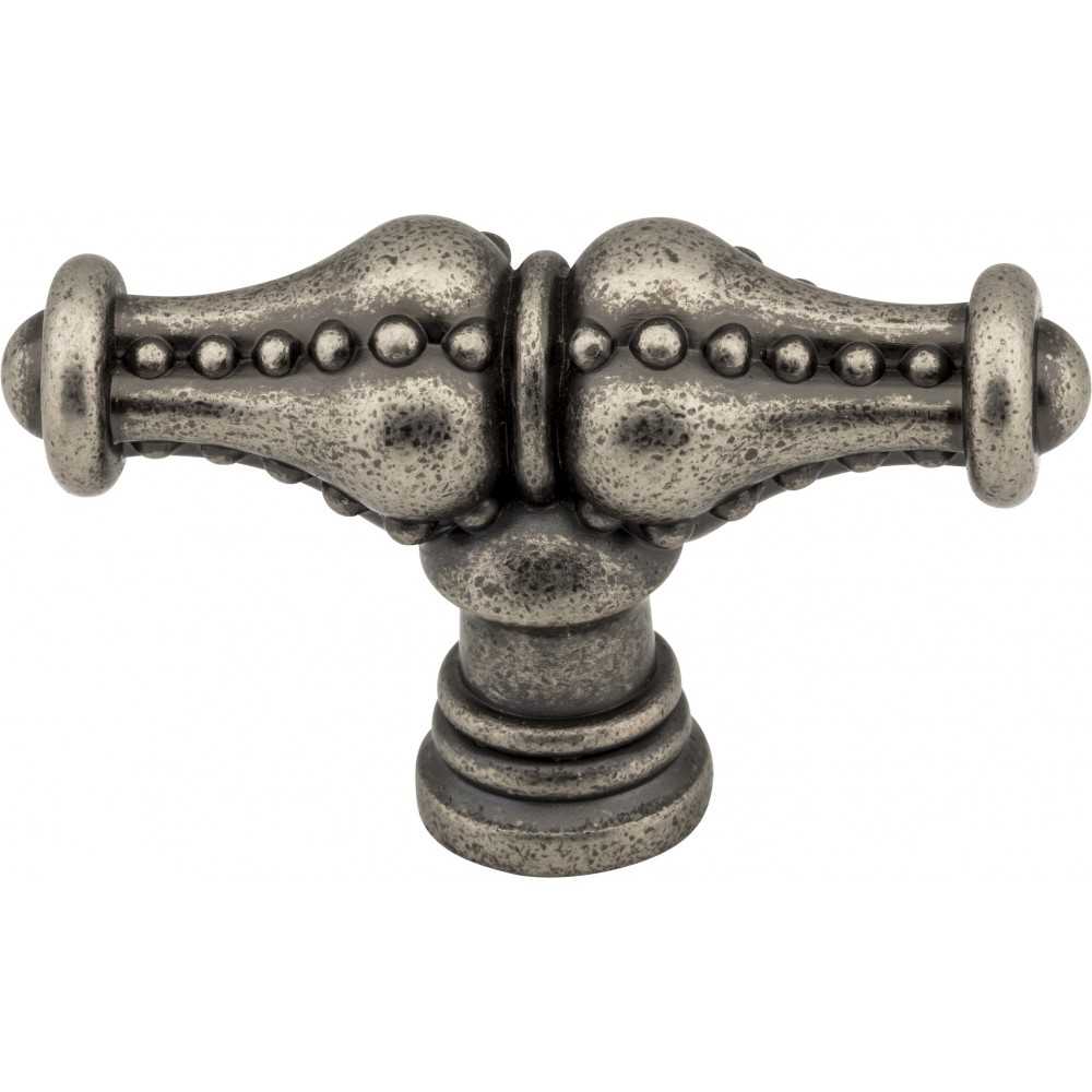 Prestige, by Jeffrey Alexander, exudes a dignified Victorian ornamental feel. This 2-1/4" overall length Distressed Pewter cabinet "T" knob has flowing, picturesque curves and rounded edges with intricate beaded detail. The knob coordinates with three standard pull lengths, an appliance handle option, as well as a 1-3/4" round knob. Choose from five finish options, each enhancing the vintage feel of this regal collection. Each item is individually wrapped to protect the item from damage. Attachment hardware is included.