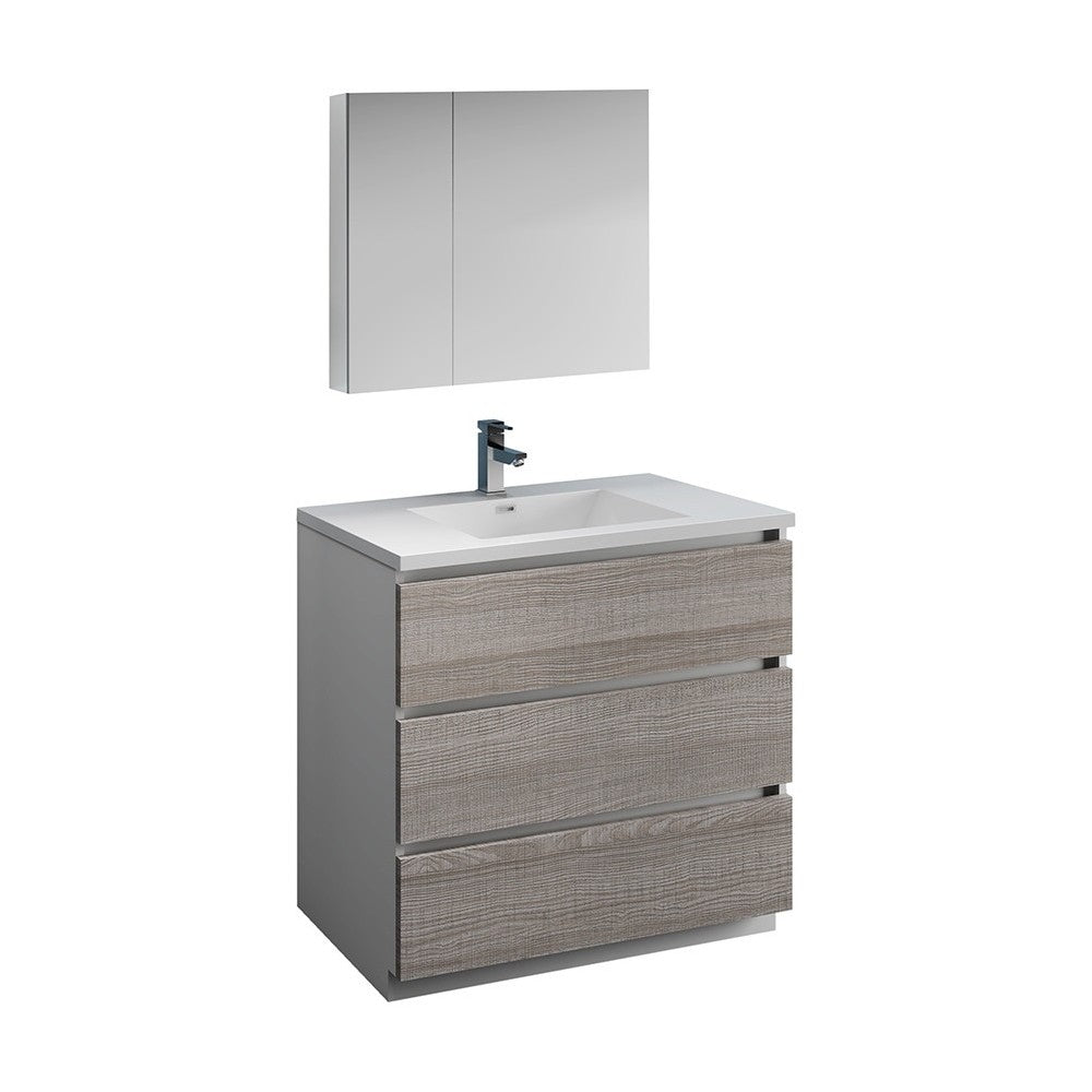 With its chic Ash Gray finish, the Fresca Lazzaro Freestanding Modern Bathroom Vanity is the ideal combination of style and function. The cabinet offers great storage with soft-closing drawers, just perfect for organizing all of your daily essentials. The drawers feature push-release hardware, offering a streamlined front that beautifully complements the minimalist design. To make installation a breeze, the cabinet comes fully assembled and includes installation hardware. Gracing the top of the cabinet is an eye-catching white acrylic-resin countertop/sink with smooth edges and integrated overflow. The sink is designed for durability and style and has been pre-drilled to accommodate a single hole faucet (included). This vanity also comes with a fully mirrored medicine cabinet with two adjustable glass shelves, to complete the look. This modern vanity is available in multiple colors and makes a stylish statement in any home