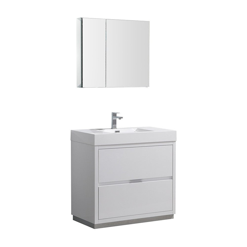 The Fresca Valencia Free Standing Modern Bathroom Vanity with Medicine Cabinet comes with everything you need to create an elegant and modern bathroom. The rectangular vanity offers great storage with two soft-closing drawers, just perfect for organizing all of your daily essentials. The drawers feature concealed aluminum handles and the cabinet has a stylish Glossy White finish. It rests on an aluminum base, adding to its modern look. The white acrylic-resin countertop/sink has smooth lines and a thick profile. It is equipped with an overflow, single hole faucet mount and includes a solid brass faucet. This ensemble also comes with a fully mirrored 30" medicine cabinet with two adjustable glass shelves, to complete the look. This lovely vanity is available in multiple sizes and makes a stylish statement in any home.