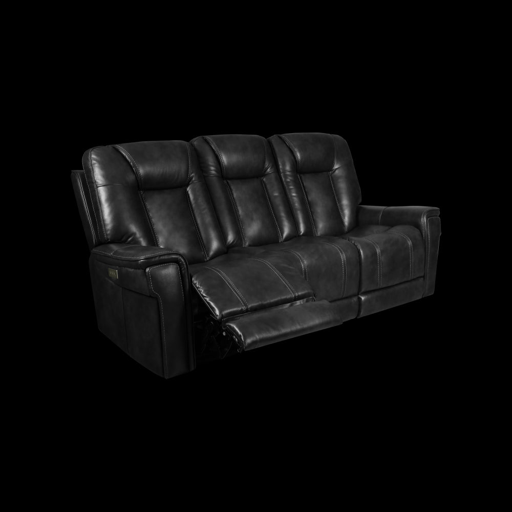 Larger scale Media sofa with power head rests, power lumbar, power recline, lay flat mechanisms and 3" footrest extension. Features include 41.7" high horseshoe back, hockey stick shaped plush arms with hidden cupholders, bucket pad over chaise seating with pocketed coil springs, and thick decorative stitching. Outside arm controller has all-close button and USB ports.