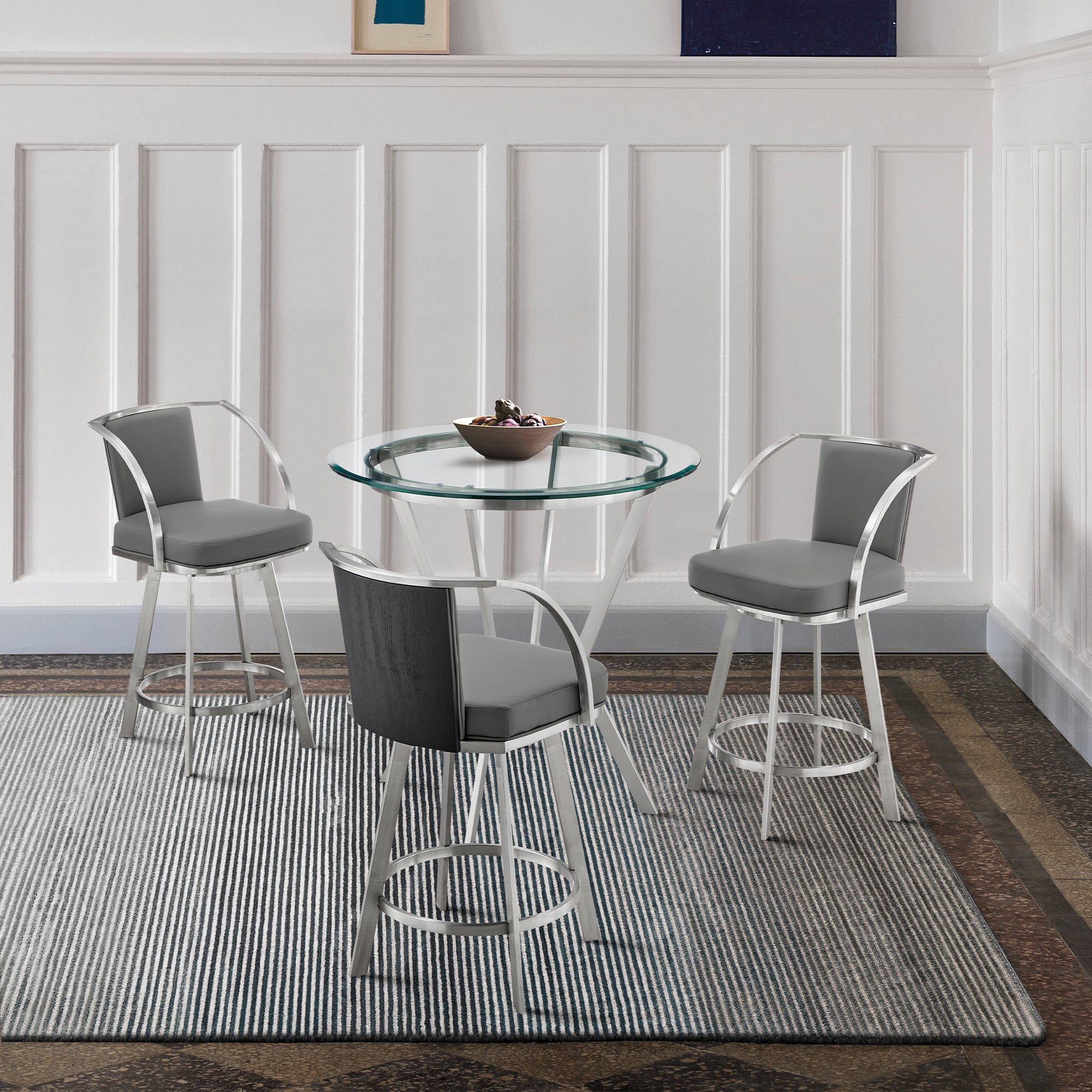 Add a touch of modern style to your home or apartment with the Naomi and Livingston counter height dining set from Armen Living. The frame of the Livingston metal bar stool is constructed from brushed stainless steel that is sturdy enough to last for many years to come. The 360-degree swivel functionality allows maximum mobility for you and your guests. The high-density foam padded cushion and backrest provide the best seat in the house, allowing you to lounge comfortably for extended periods. The Naomi Bar Table from is a contemporary piece that adds a touch of pure sophistication to any kitchen, bar, or lounge area, or even a breakfast nook. It features a strong and striking stainless steel x-shaped base, giving it a sleek and stunning visual. The round tempered glass top completes the elegant look, while also contributing to the durability of this piece. This glass and metal dining set is ideal for meals, cocktail hours, card games, and more! The mixture of the glass, wood, and metal materials gives you an eclectic style without compromising its refined design. The Livingston and Naomi counter height dining set features a brushed stainless-steel frame, glass tabletop, grey faux leather upholstery and a black wood back accent on the bar stools. This 4 – piece dining set includes 1 round bar table, and 3 counter height bar stools. The Livingston bar stools have a 26 inch seat height and can support up to 250lbs per seat.
