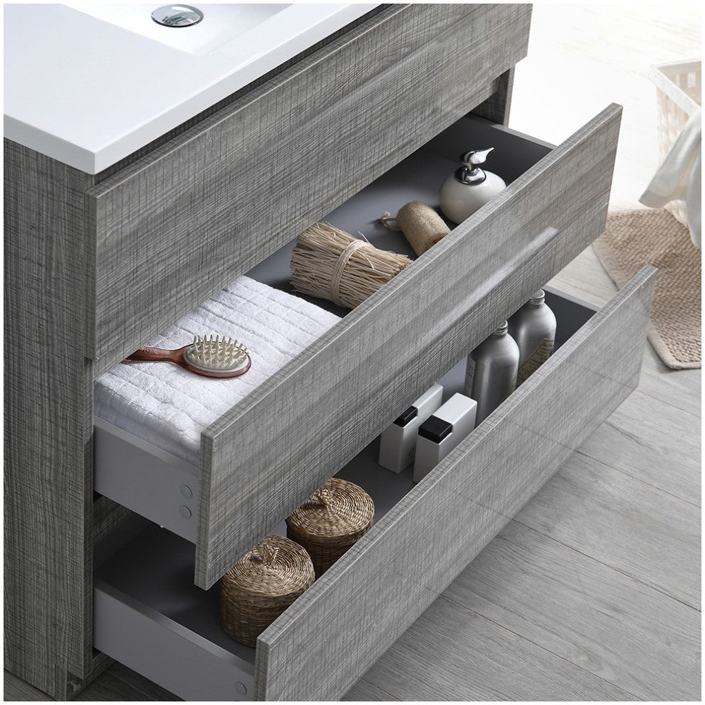 With its stylish Ash Gray finish, the Fresca Lazzaro Freestanding Modern Bathroom Vanity is the ideal combination of style and function. Spacious soft-closing wood drawers can hold all of your bathroom essentials, while a roomy under-the-sink compartment provides additional space for tucking away towels or storage baskets. The drawers and doors feature push-release hardware, offering a streamlined front that beautifully complements the minimalist design. Gracing the top of the cabinet is an eye-catching white acrylic-resin countertop/sink with smooth edges and integrated overflow. The sink is designed for durability and style and has been pre-drilled to accommodate a single hole faucet (included). This vanity also comes with a fully mirrored medicine cabinet with two adjustable glass shelves, to complete the look. This modern vanity is available in multiple colors and makes a stylish statement in any home