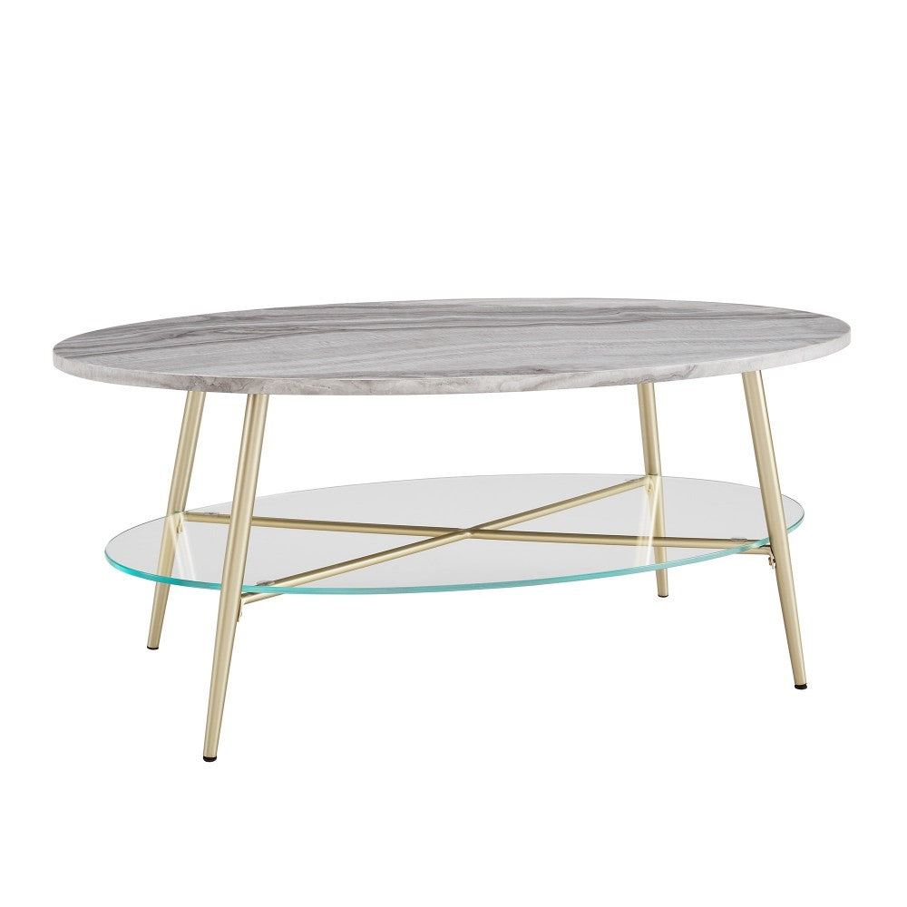 Add a sophisticated touch to your living room or den with this modern glam coffee table. The mix of faux marble and tempered safety glass shelves provide a mature aesthetic to brighten your home. Your guests will compliment the contemporary frame completed with angled metal legs and an oval shape. The tabletop finish looks even more realistic with the water-resistant, high-gloss UV coating. The warp-resistant MDF wood build create a long-lasting piece you can rely on for game nights or cocktail hours.