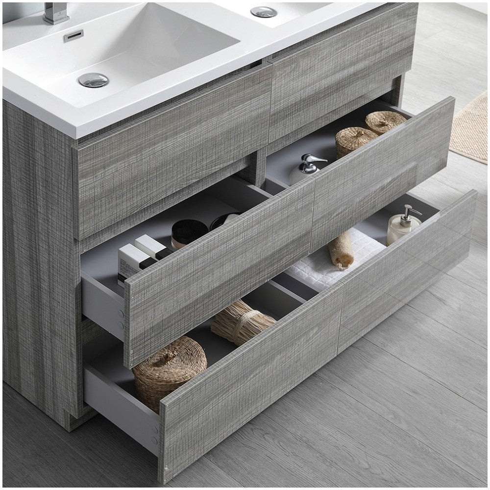 With its chic Ash Gray finish, the Fresca Lazzaro Freestanding Modern Bathroom Cabinet with Integrated Double Sink is the ideal combination of style and function. Six spacious soft-closing wood drawers offer wonderful storage space, perfect for keeping all of your daily essentials out of sight and the family organized. The drawers feature push-release hardware, offering a streamlined front that beautifully complements the minimalist design. Gracing the top of the cabinet is an eye-catching white acrylic-resin countertop/double sink with smooth edges and integrated overflow. The sinks have been pre-drilled to accommodate single hole faucets (sold separately). This modern cabinet with integrated double sink will enhance any decor and is available in multiple sizes and finishes. It includes installation hardware