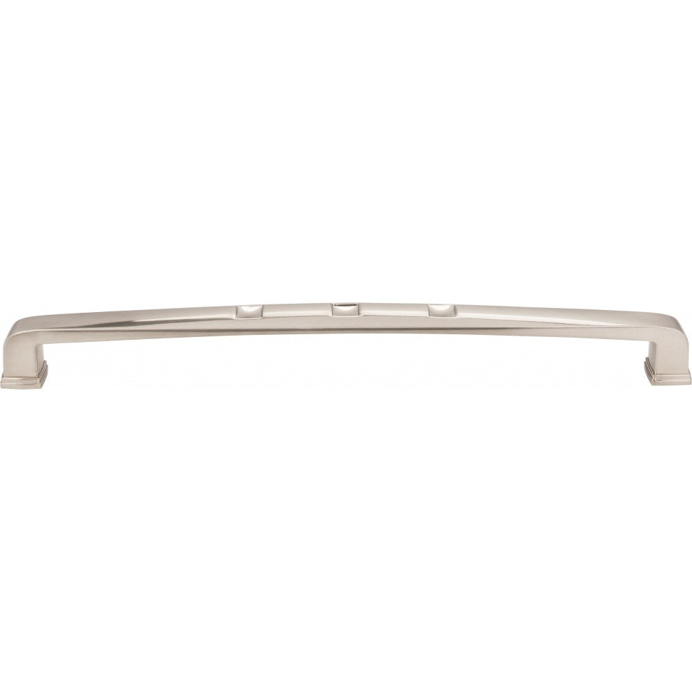 - 12-13/16" Overall Length Modern Cabinet Pull. Holes are 12" center-to-center. Packaged with two 8-32 x 1" and two Break-away screws. Finish: Satin Nickel