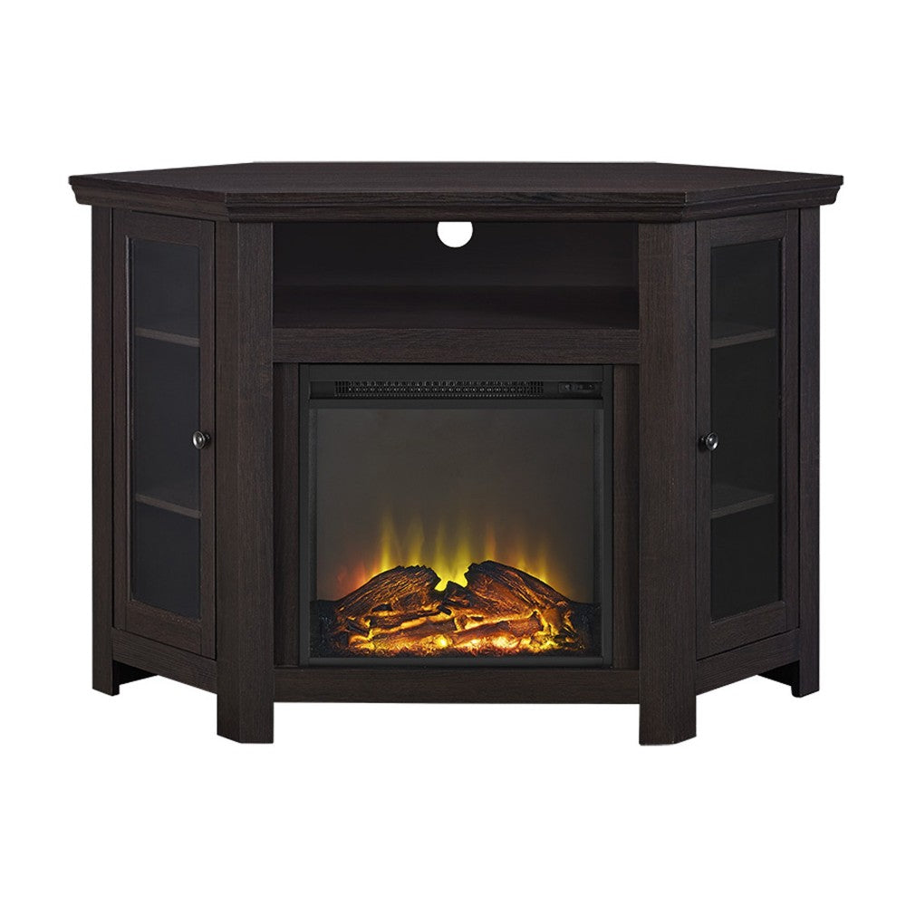 Utilize your corner space with this classic 48-inch wood media stand with electric fireplace. Its corner design makes this the perfect space saving unit while creating a warm, entertaining space in your home. This traditional fireplace console is crafted from warp-resistant MDF with a durable laminate finish and can accommodate a TV up to 55 inches. Features shelving behind two tempered glass doors, an open shelf to fit your media components and accessories, and a cable management system to maintain a tidy space. Installation requires no electrician, simply plug into a standard household outlet and no venting required.