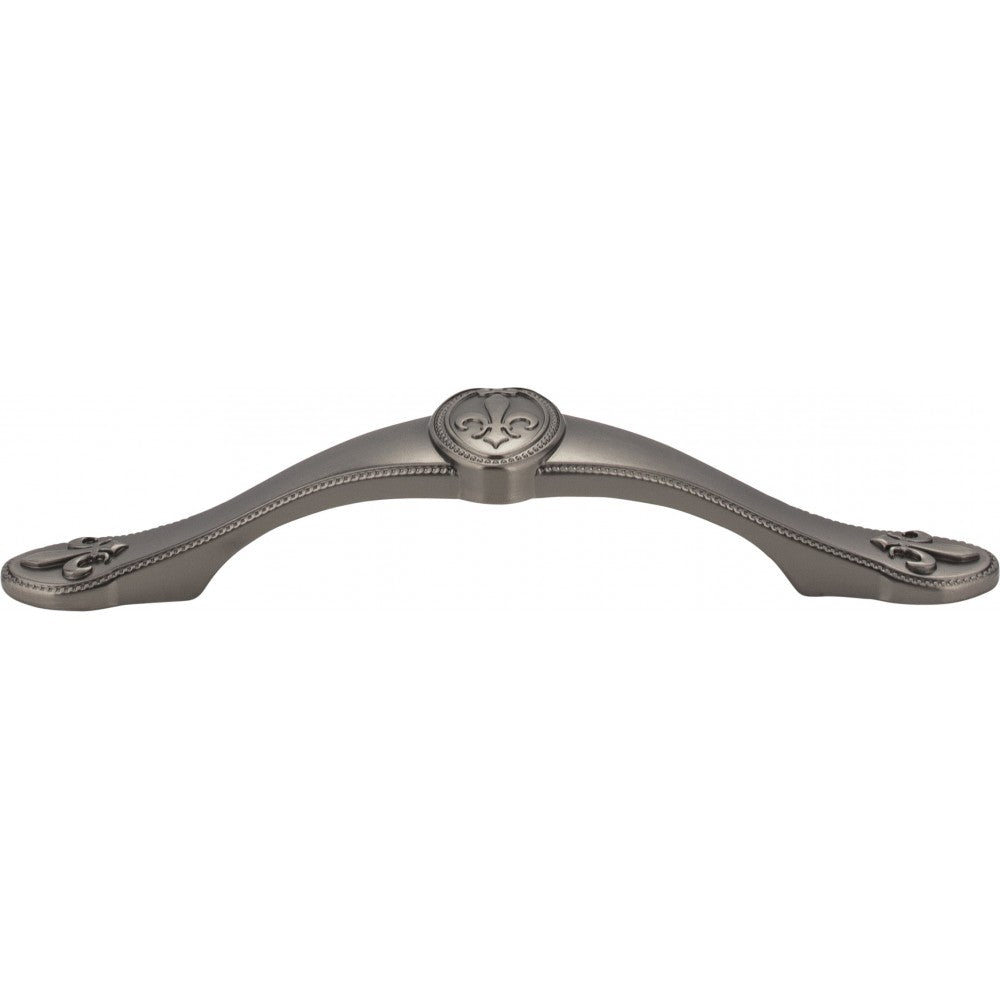 - 5-13/16" Overall Length Fleur-de-lis Cabinet Pull. Holes are 96 mm center-to-center. Packaged with two 8-32 x 1" and two Break-away screws. Finish: Brushed Pewter