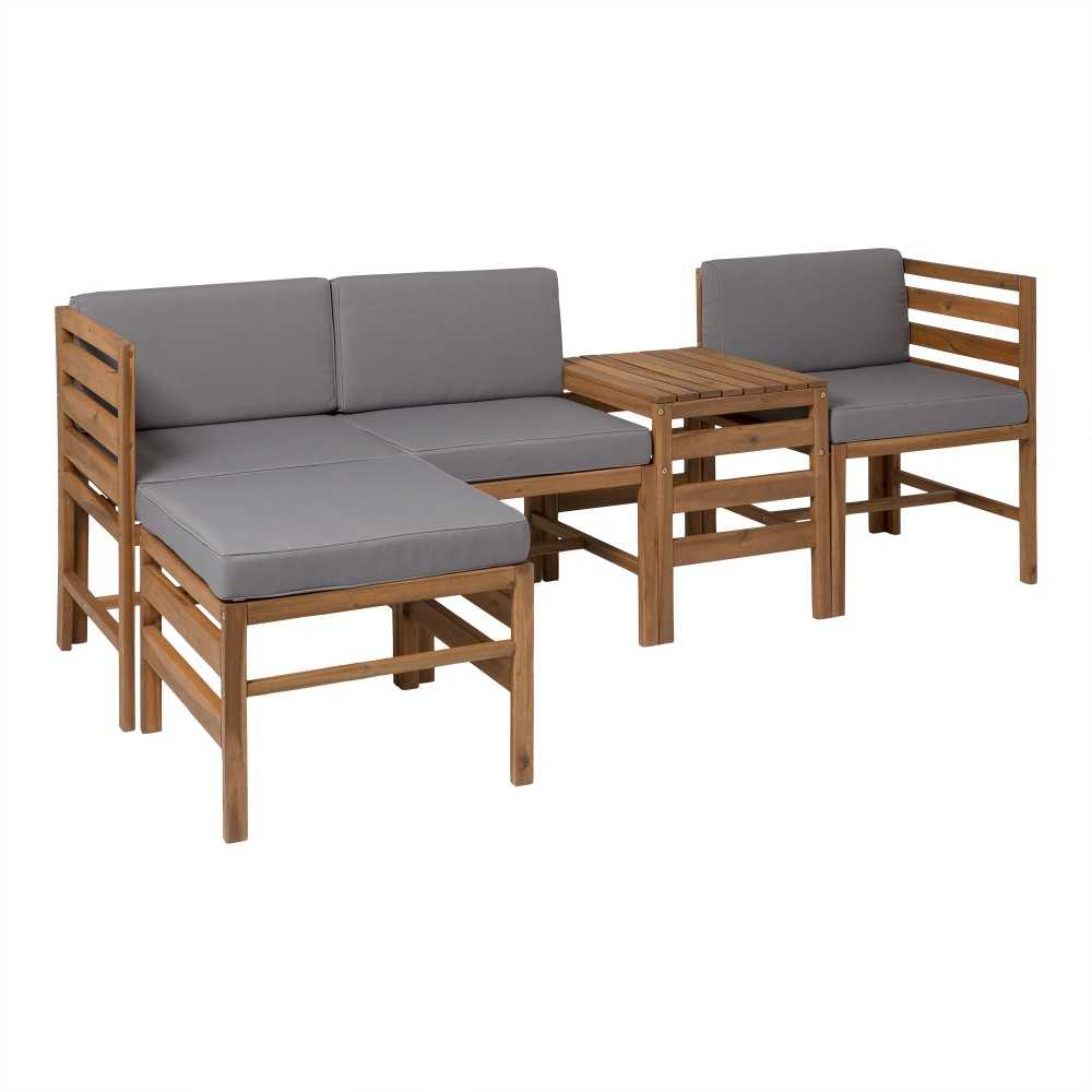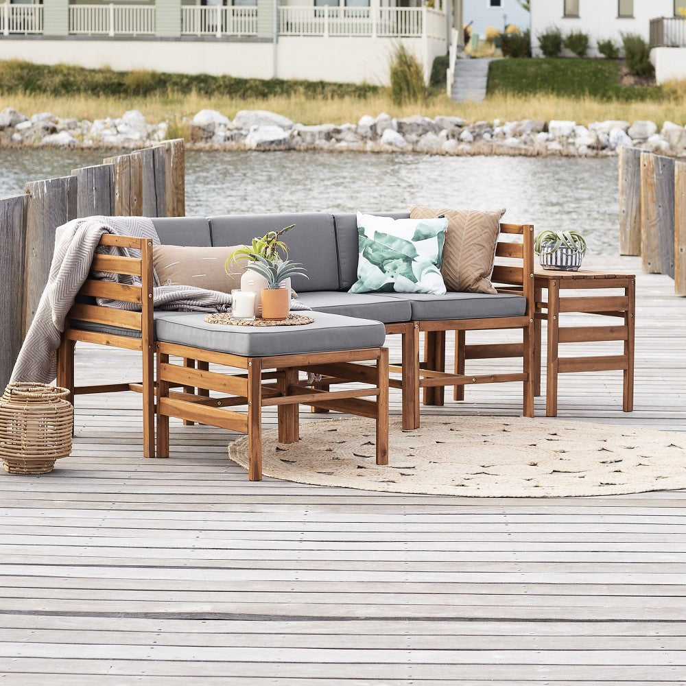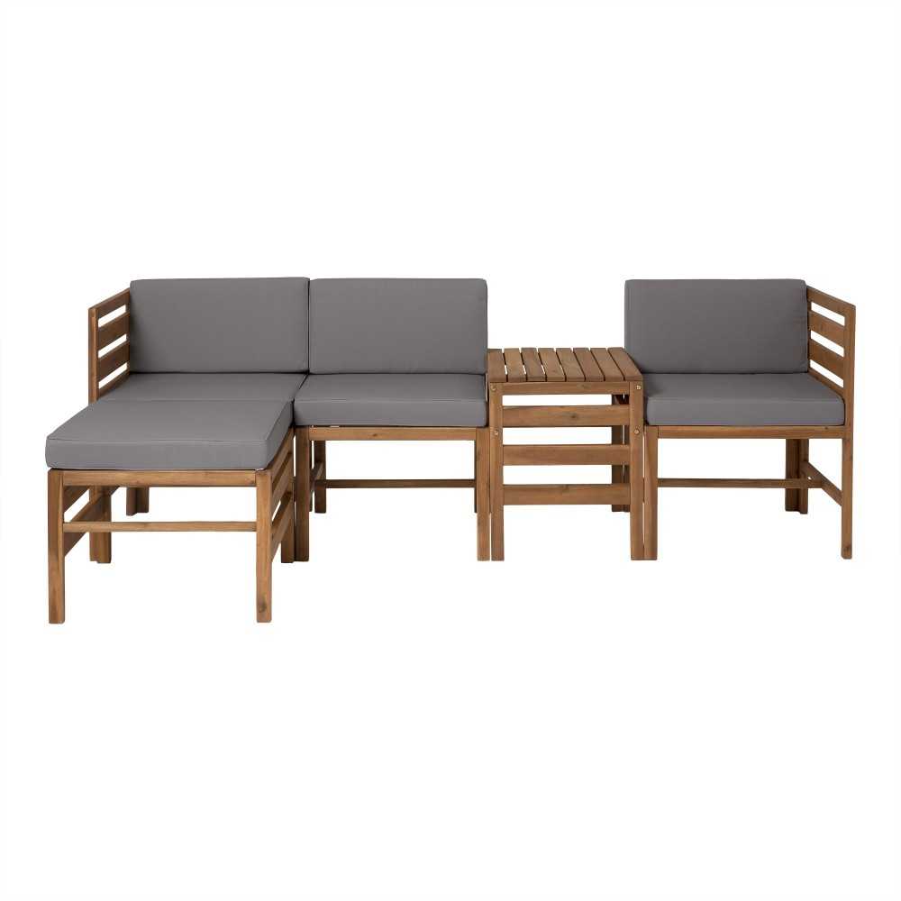 Eco-friendly meets patio with this stunning five-piece, modular, outdoor conversation set. Responsibly harvested, the solid acacia wood shapes the sleek, safari-inspired, two-toned build. UV, weather-resistant, and removable cushions complete the chic-global look that will last""and they're machine washable! Two armchairs, an ottoman, one armless chair, and a side table are yours to design however you like as they're constructed with segmental frames. Arrange chairs in an L-shaped couch, a clean single line, or a fun, square set up. The possibilities are endless! Put the earth""and your style""first and rest easy knowing you've welcomed home a responsible purchase.