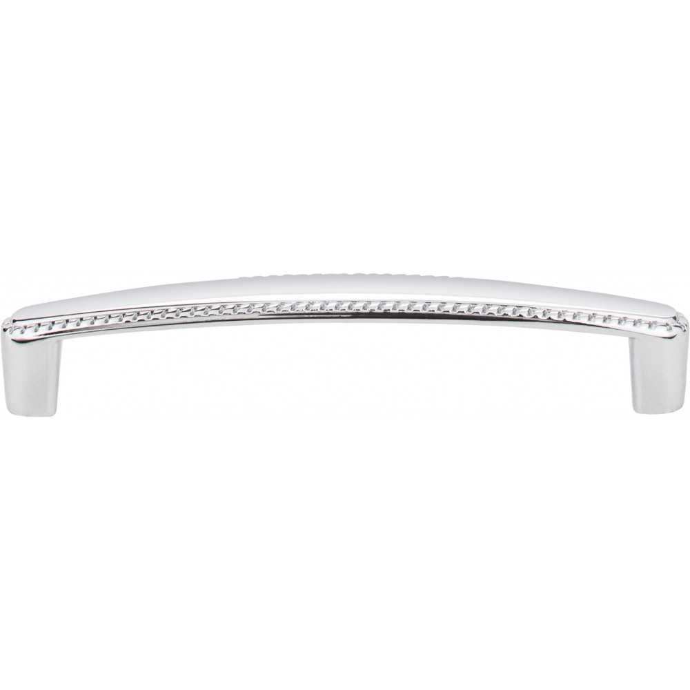 - 5-9/16" Overall Length Rope Trim Cabinet Pull. Holes are 128 mm center-to-center. Packaged with two 8-32 x 1" and two Break-away screws. Finish: Polished Chrome