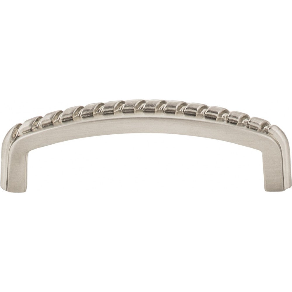 The Artesian style rope accent of this Satin Nickel 3-7/16" overall length pull in the Cypress collection by Elements adds sophisticated appeal to your home with craftsmanlike detail. With a coordinating rope detailed knob and additional pull length, this collection is the perfect accent to any cabinet and is available in three other finishes. Each item is individually wrapped to protect the item from damage. Attachment hardware is included.