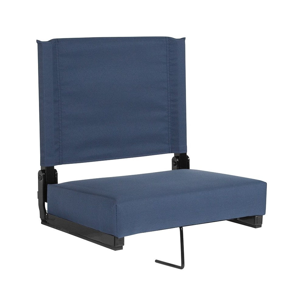 Love your team but hate those bleachers? Ever feel like you're the one who got tackled when the game's over? Now there's a better way! Watch the game from the comfort of your Ultra-Padded Stadium Seat. Compact and portable with a built in carrying handle and sturdy grip, this stadium seat is the lightest of its kind. Weighing in at a mere 7.6 pounds, this amazing seat can support up to 500 pounds to accommodate most users. With its padded back and 3 inch foam seat, you'll be so comfortable you won't want the game to end. If you're worried about safety this padded stadium chair features rubber strips on the bottom prevent the seat from sliding. A built-in bleacher hook provides added stability when sitting on wooden and metal bleachers and easily pivots out of the way to sit on the ground. Did you jump up to cheer and forgot you had your drink or nachos in your hand? Fear not, this bleacher chair can be spot cleaned with a wet cloth, for tought stains use a solvent based cleaner. Not just for game day, take your game day seat with you when you go camping, to the beach and outdoor concerts. [XU-STA-NAVY-GG]