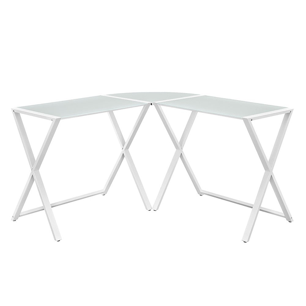 With x-frame designed legs, this versatile l-shaped desk gives a modern feel to your home. Having an angled design made of sturdy, steel metal with a powder coated finish with a tempered glass top, this contemporary desk can fit in just about any corner space, from your home office to your living room. Decorate with vases and framed family pictures, while using it to write on or to work on your computer.