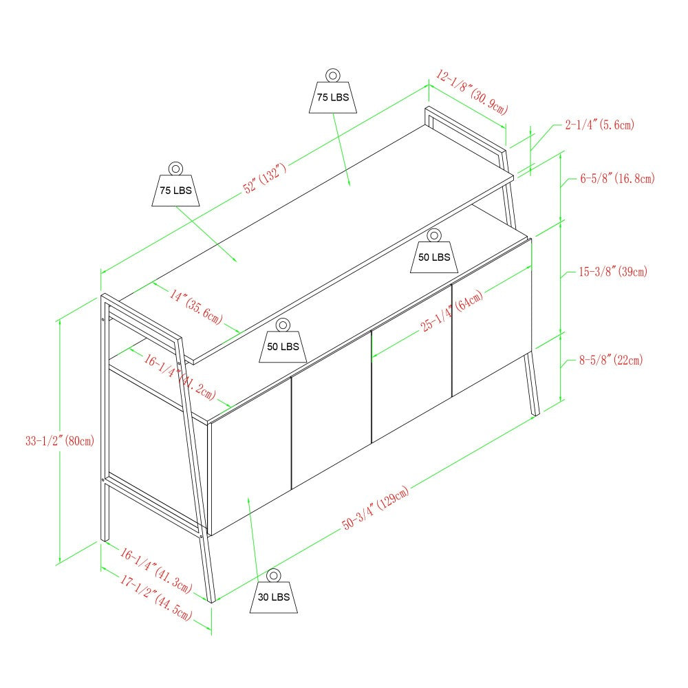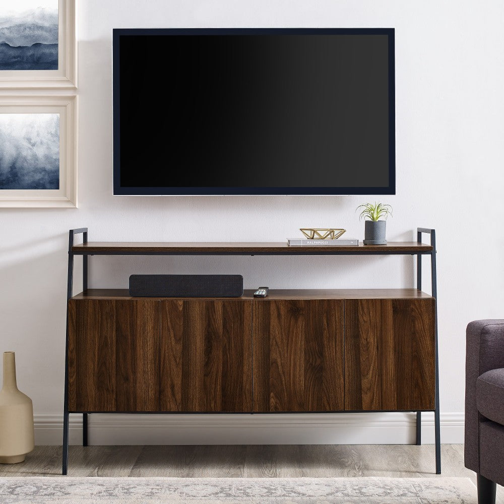 Angled metal sides and a wood facade emanate an urban industrial feel while open and closed storage, beveled door fronts and soft-close hinges maintain the sleek and clean vibes of the piece. Interior adjustable shelves and cord management allow this media stand to suit your entertainment needs with ease, whether you're housing vinyl records or gaming consoles. Altogether the outstanding performance and dangerous good looks of this mixed material TV stand will play the starring role in your entertainment space.