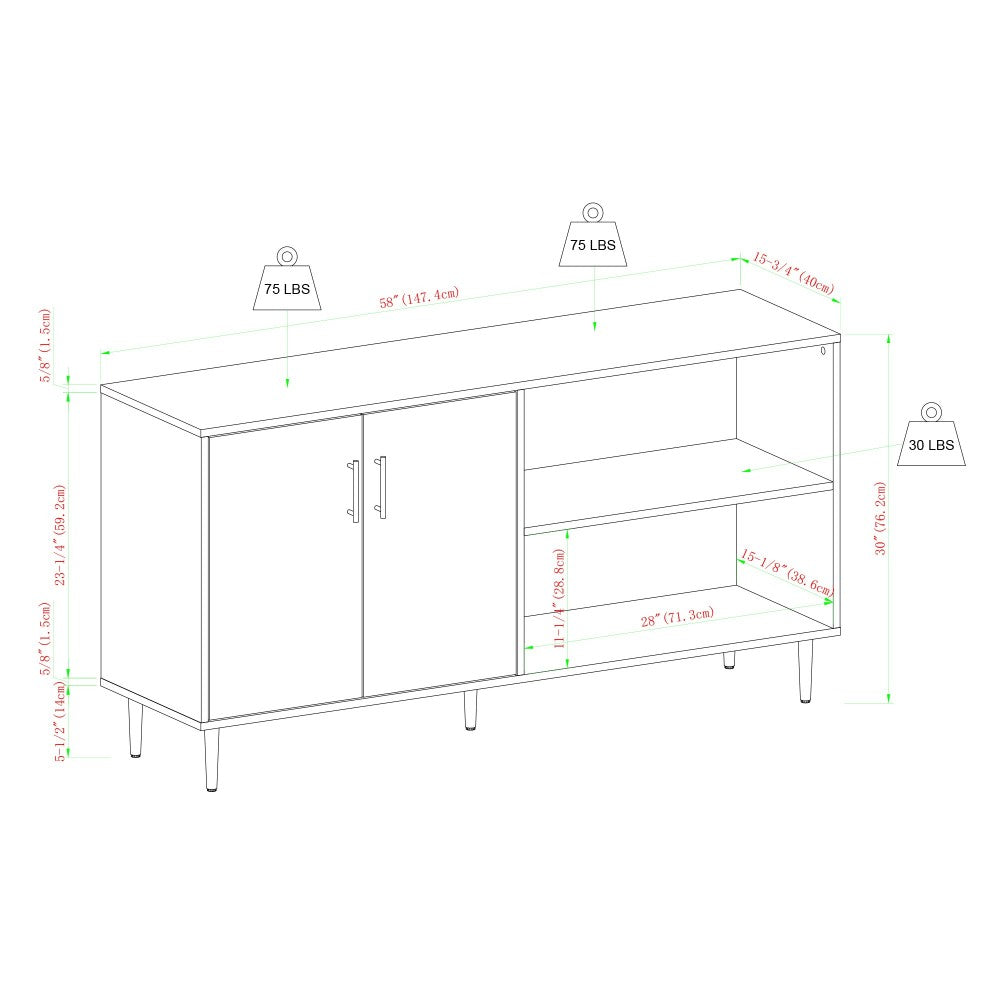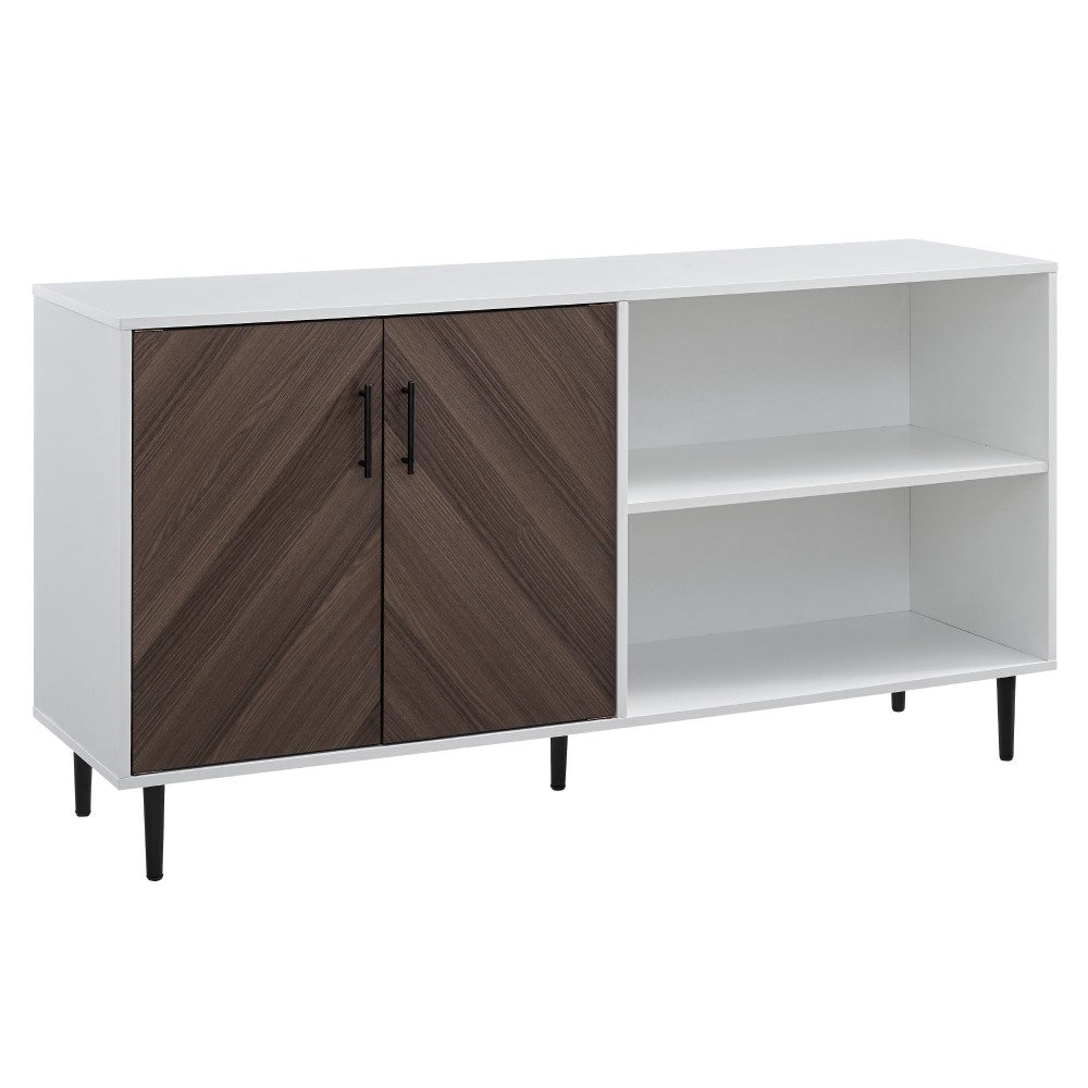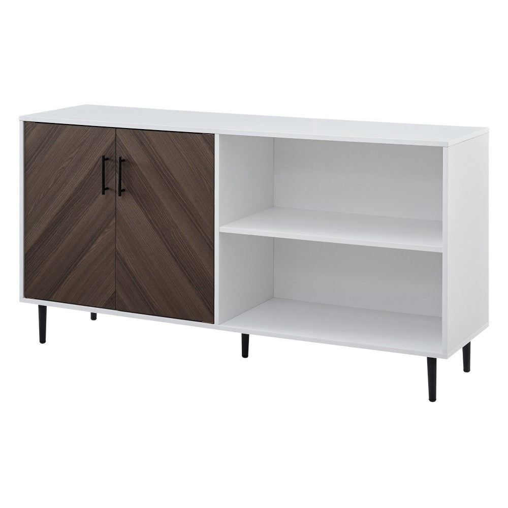 Enjoy watching movies in the comfort of your own home with this TV stand. Making an ideal entertainment center by having open and closed storage in an asymmetrical design. Bookmatched styled cabinet doors give a visually interesting element to this entertainment center. With a flattering two-tone surface made from durable laminate and metal angled legs. This media console will give your living room a Mid-century modern flair you'll love.