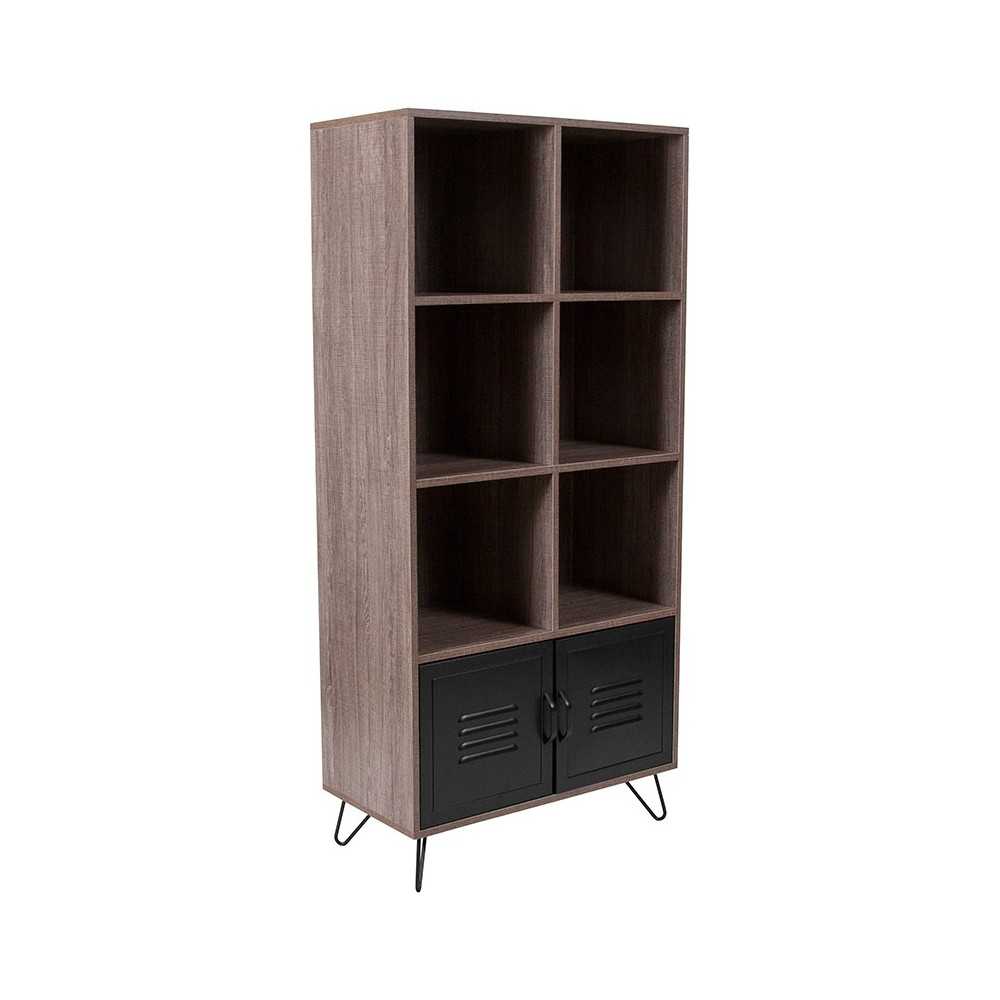 59.25"H 6 Cube Storage Organizer Bookcase with Metal Cabinet Doors and Metal Legs in Rustic Wood Grain Finish