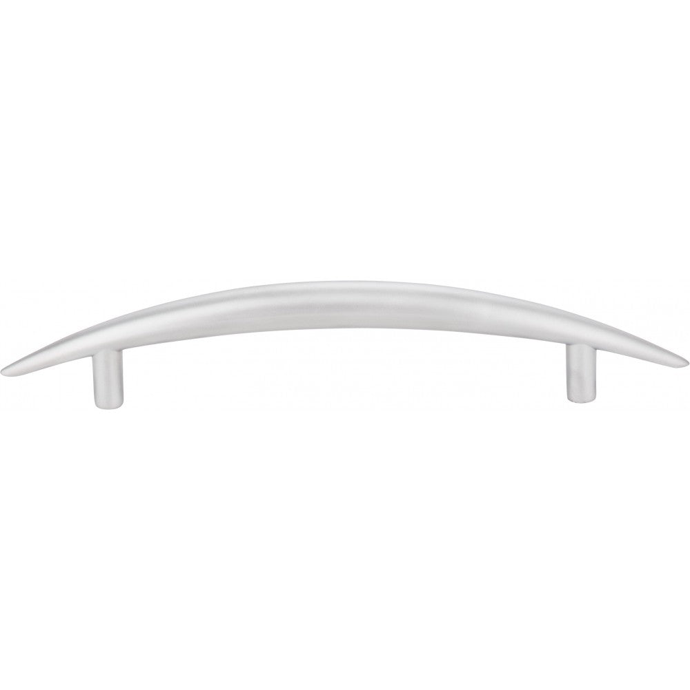 - 7-3/8" Overall Length Curved Cabinet Pull. Holes are 128 mm center-to-center. Packaged with two M4 screws. Finish: Matte Silver